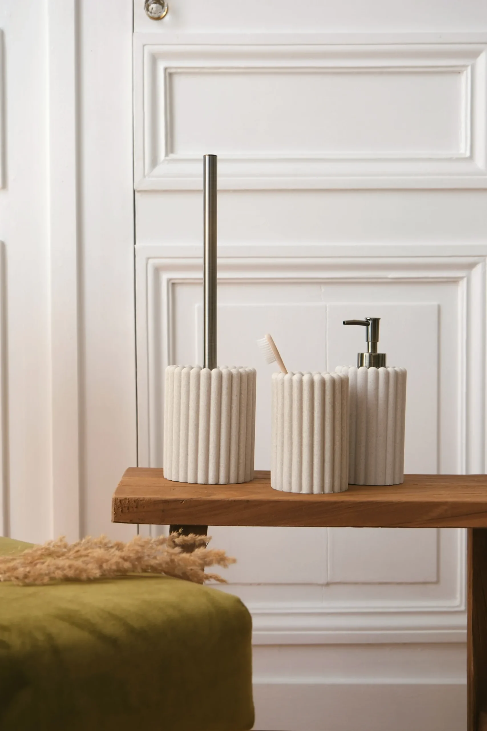 Distributeur de savon liquide en grès et frêne. Vous apprécierez ce mélange de 2 matières qui apporte une touche déco contemporaine à votre salle de bain.