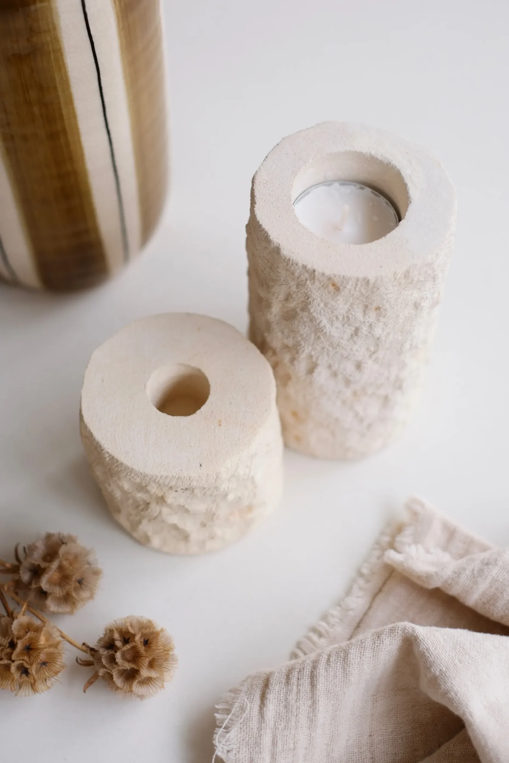 Ce bougeoir en grès naturel célèbre la beauté brute des matériaux authentiques selon la philosophie wabi-sabi japonaise. Taillé et sculpté à la main dans une pierre de grès compactée naturellement, chaque pièce révèle des variations uniques de teintes beiges, crème et sable.