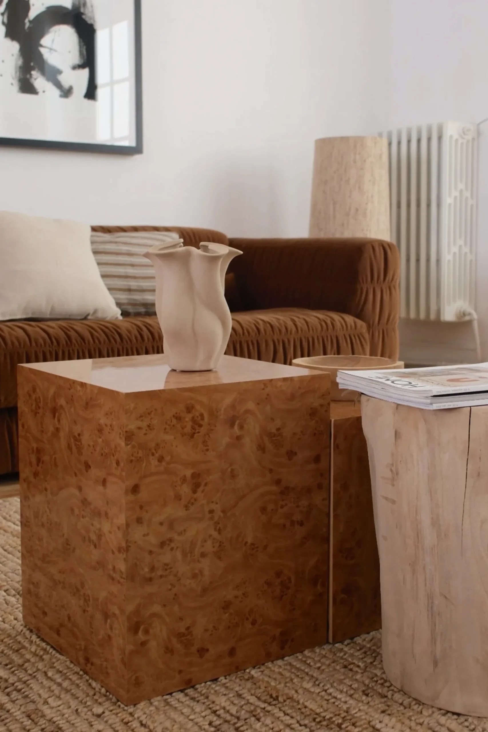 Avec son effet loupe d’orme et son design simple inspiré du mobilier d’atelier, ce bout de canapé apporte caractère et matière à votre espace. Utilisable en table d’appoint, en piédestal pour une lampe ou comme chevet minimaliste, il conjugue praticité et présence décorative.