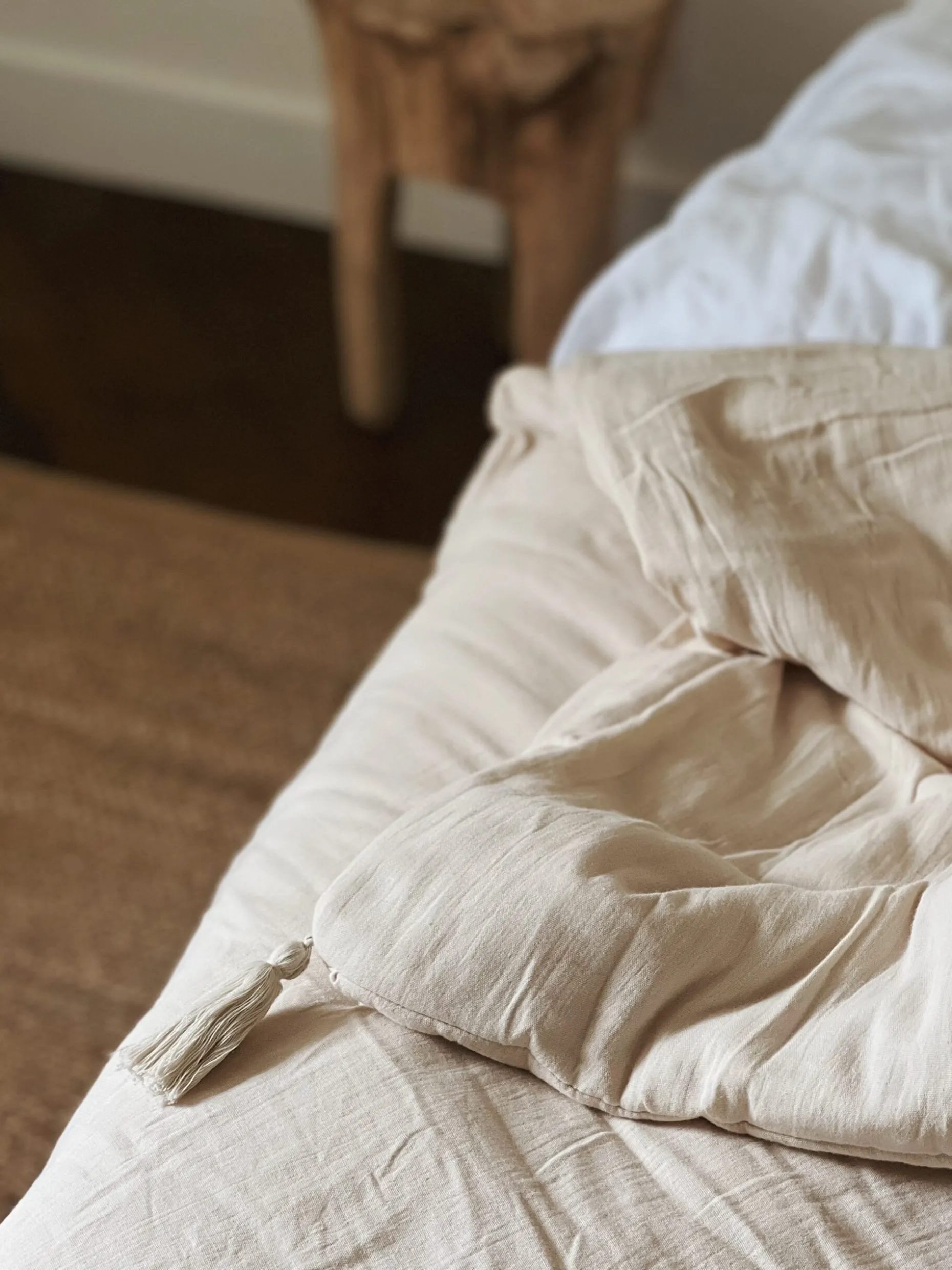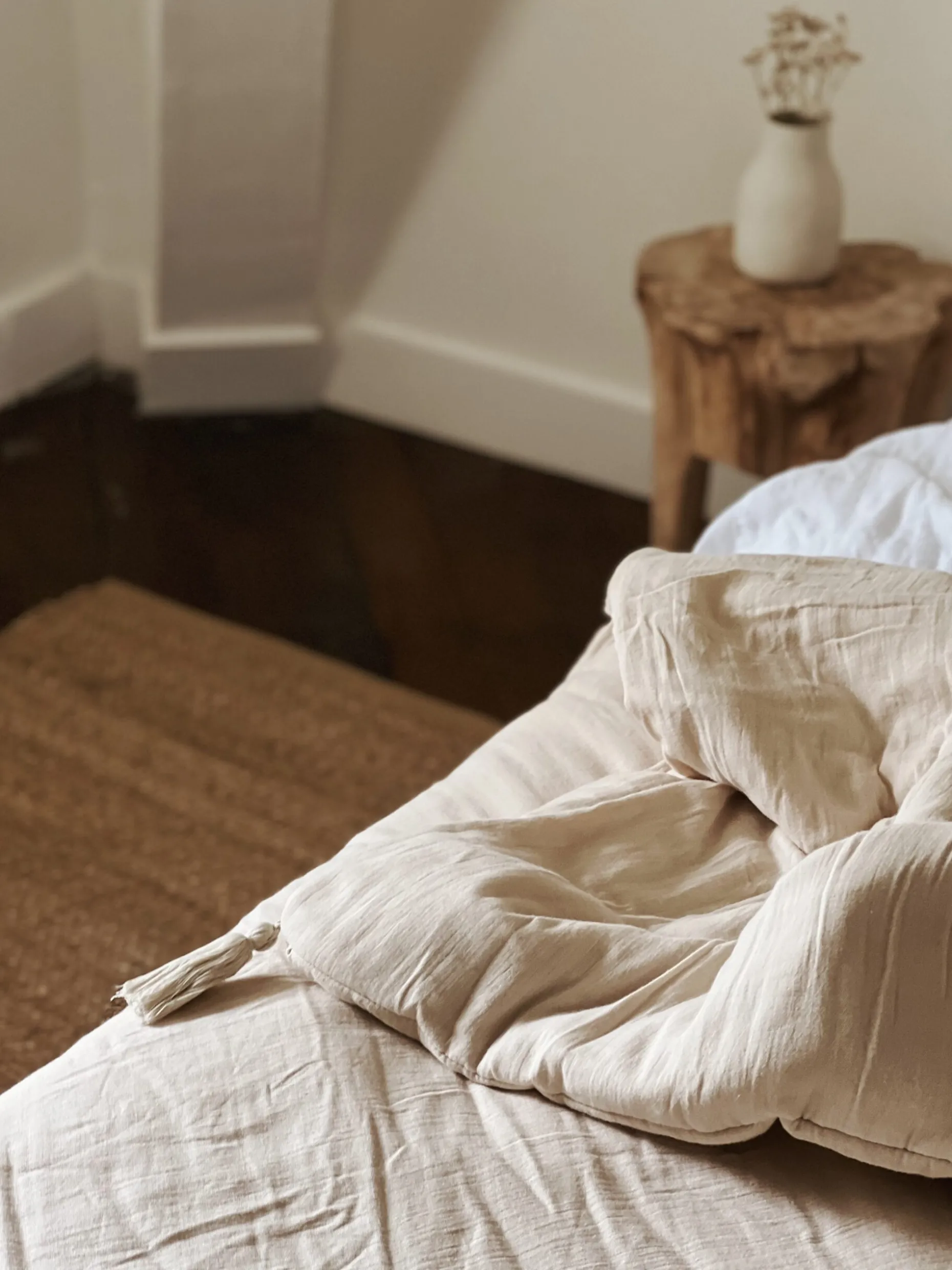Courtepointe en double gaze de coton à la fois douce, résistante et légèrement froissé ! Vous apprécierez les pompons aux extrémité de l’édredon. Cette matière naturelle vous apportera le confort nécessaire pour passer des nuits paisibles