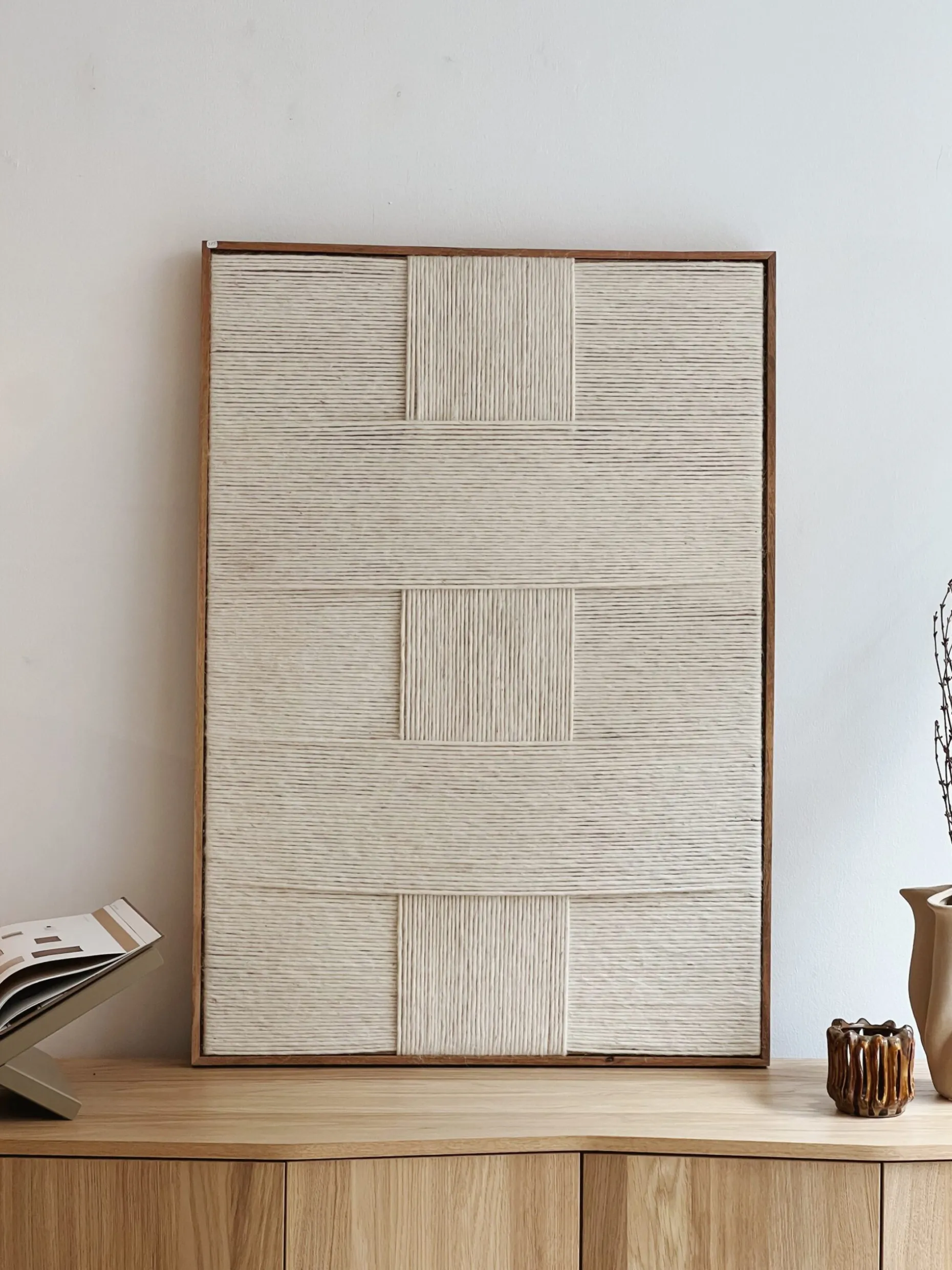 Décoration murale faite à la main où la ficelle de laine est soigneusement tendue et tissée sur un cadre en bois de manguier. Grâce à ce matériau, une dimension et une texture supplémentaires sont ajoutées à votre espace.