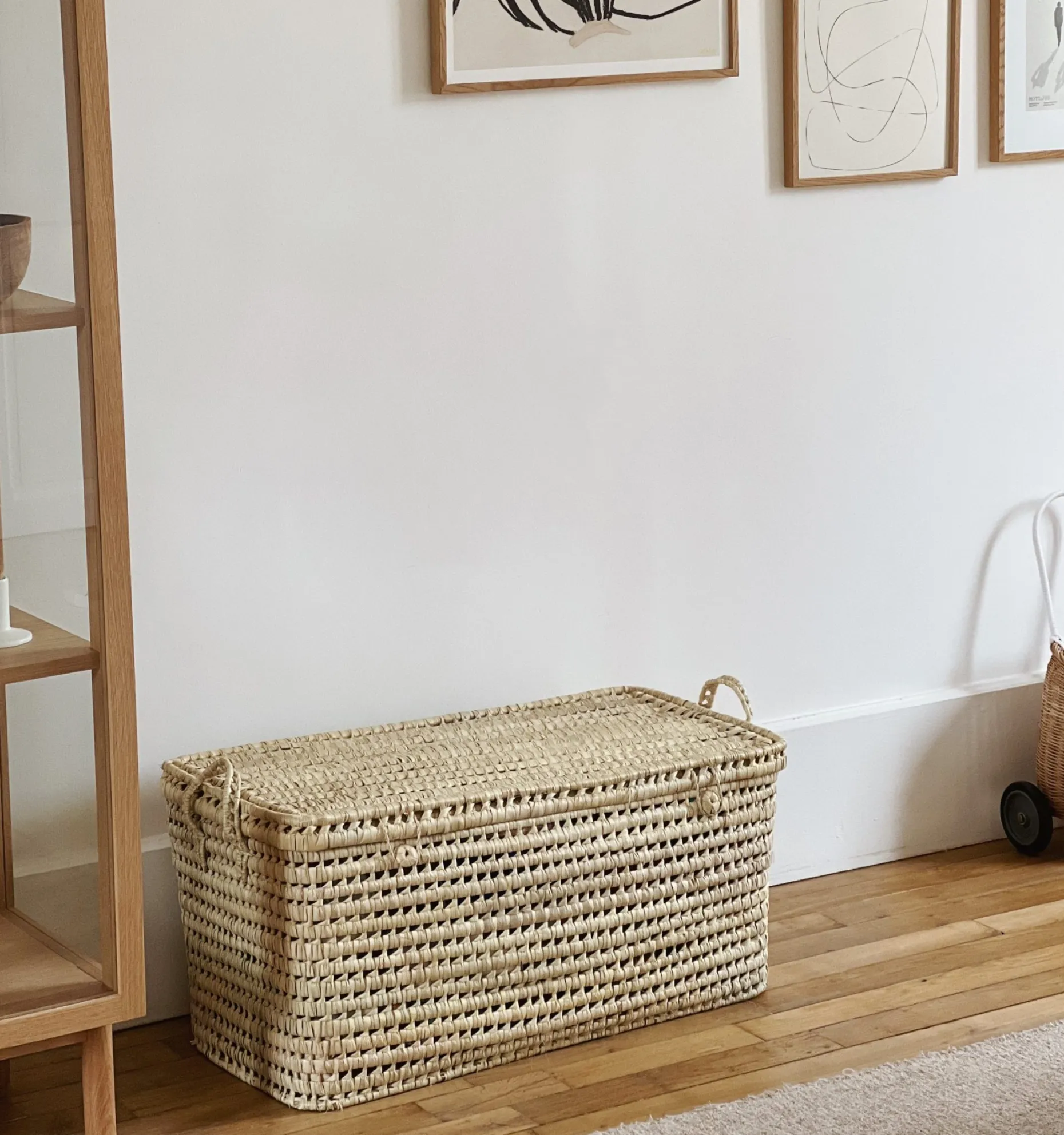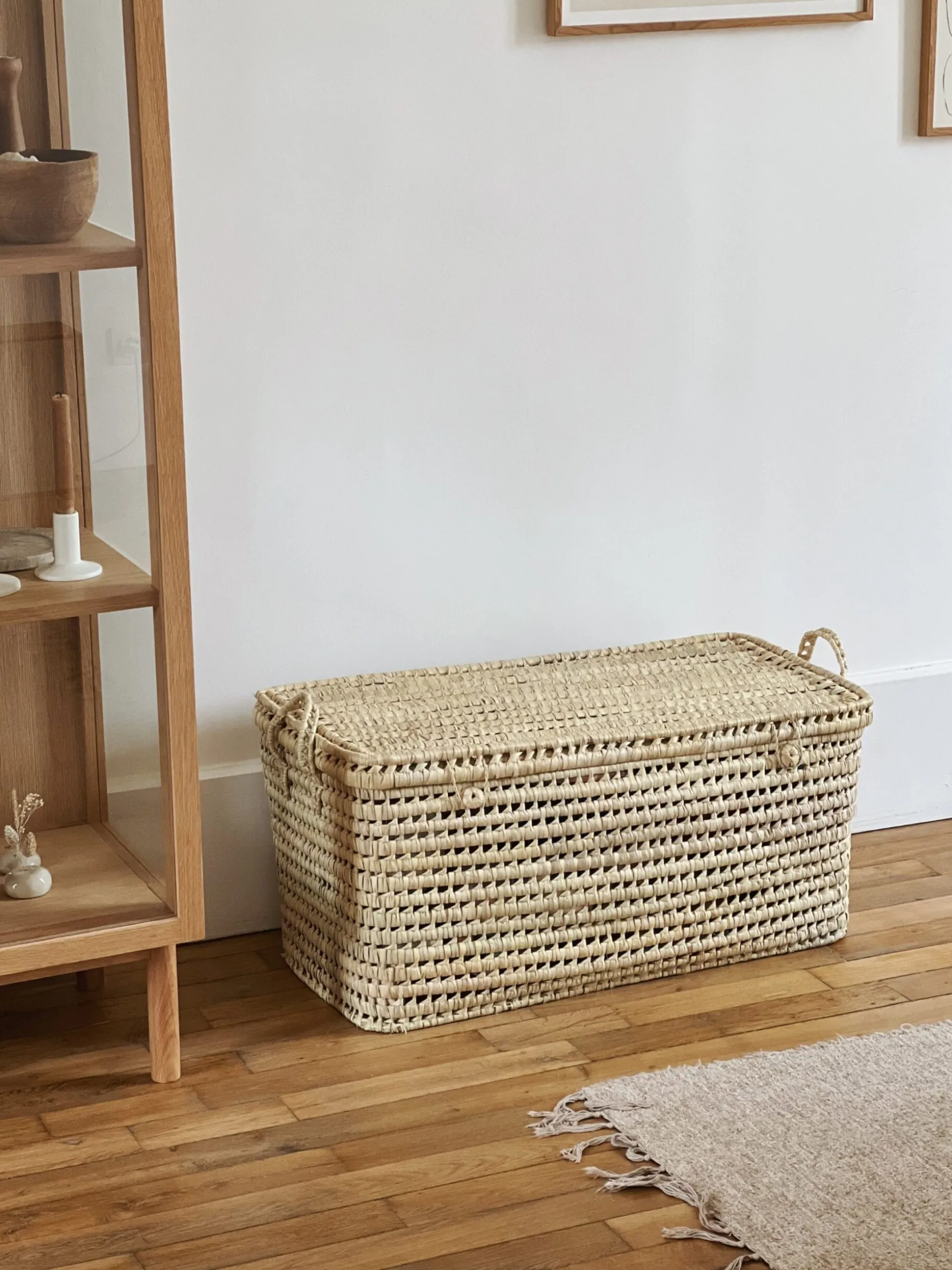 Grand coffre de rangement réalisé à la main en feuille de palmier. Cette malle est l’accessoire idéal au quotidien pour ranger votre maison. Pratique et jolie cette malle de rangement avec couvercle apportera une touche déco bohème à votre intérieur tout en rangeant jouets, plaids et linge de maison. Le coffre possède 2 anses de chaque côté pour une utilisation facile et un couvercle qui ferme à l’aide de 2 boutons en feuille de palmier.