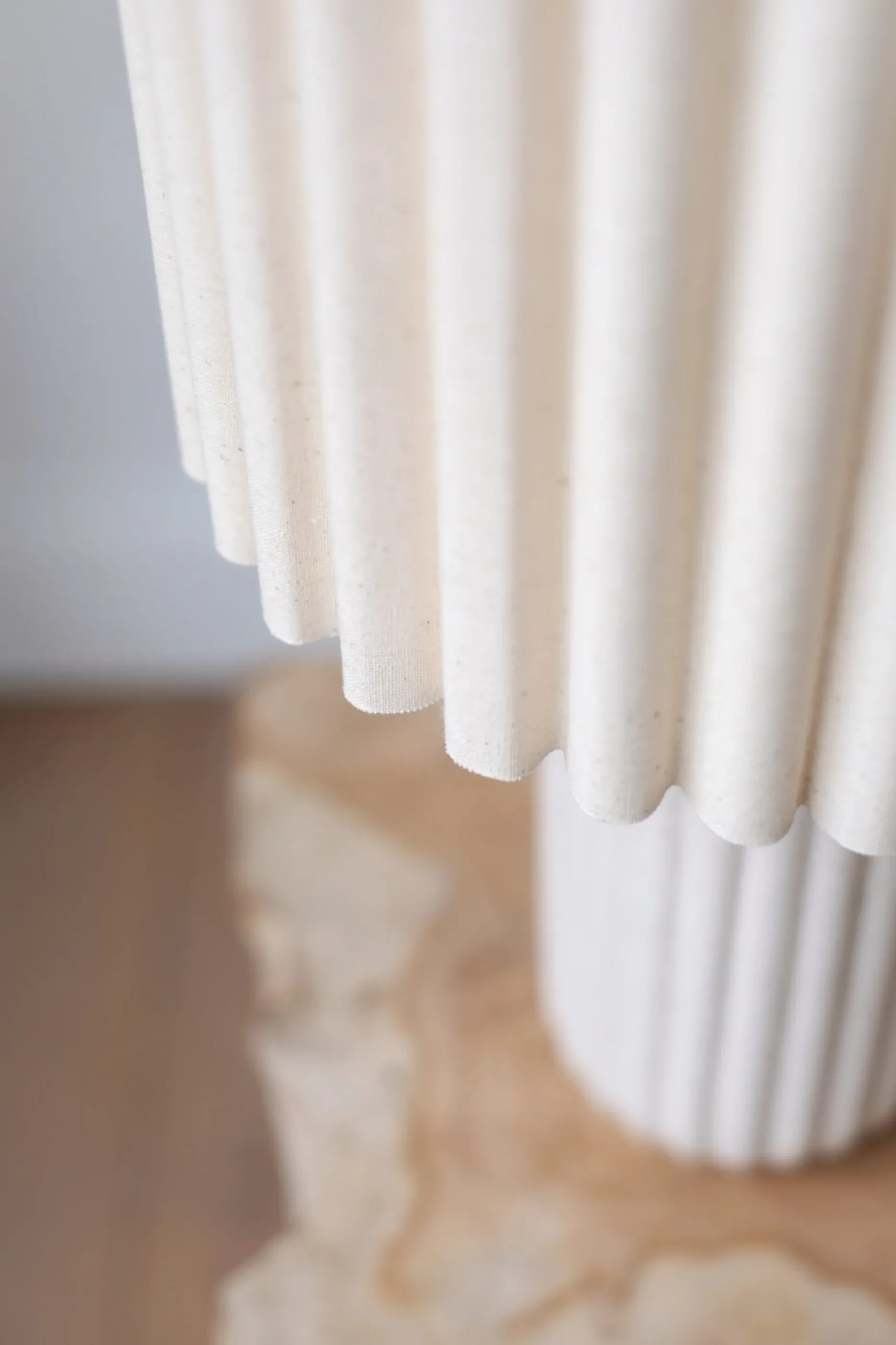 La lampe à poser Minera devient l’alliée parfaite de vos espaces intimistes. Haute de 43 cm, elle reprend l’allure sculpturale de sa grande sœur le lampadaire avec son pied en relief vertical aux lignes sobres et régulières, surmonté d’un abat-jour cylindrique plissé qui diffuse une lumière douce et enveloppante.