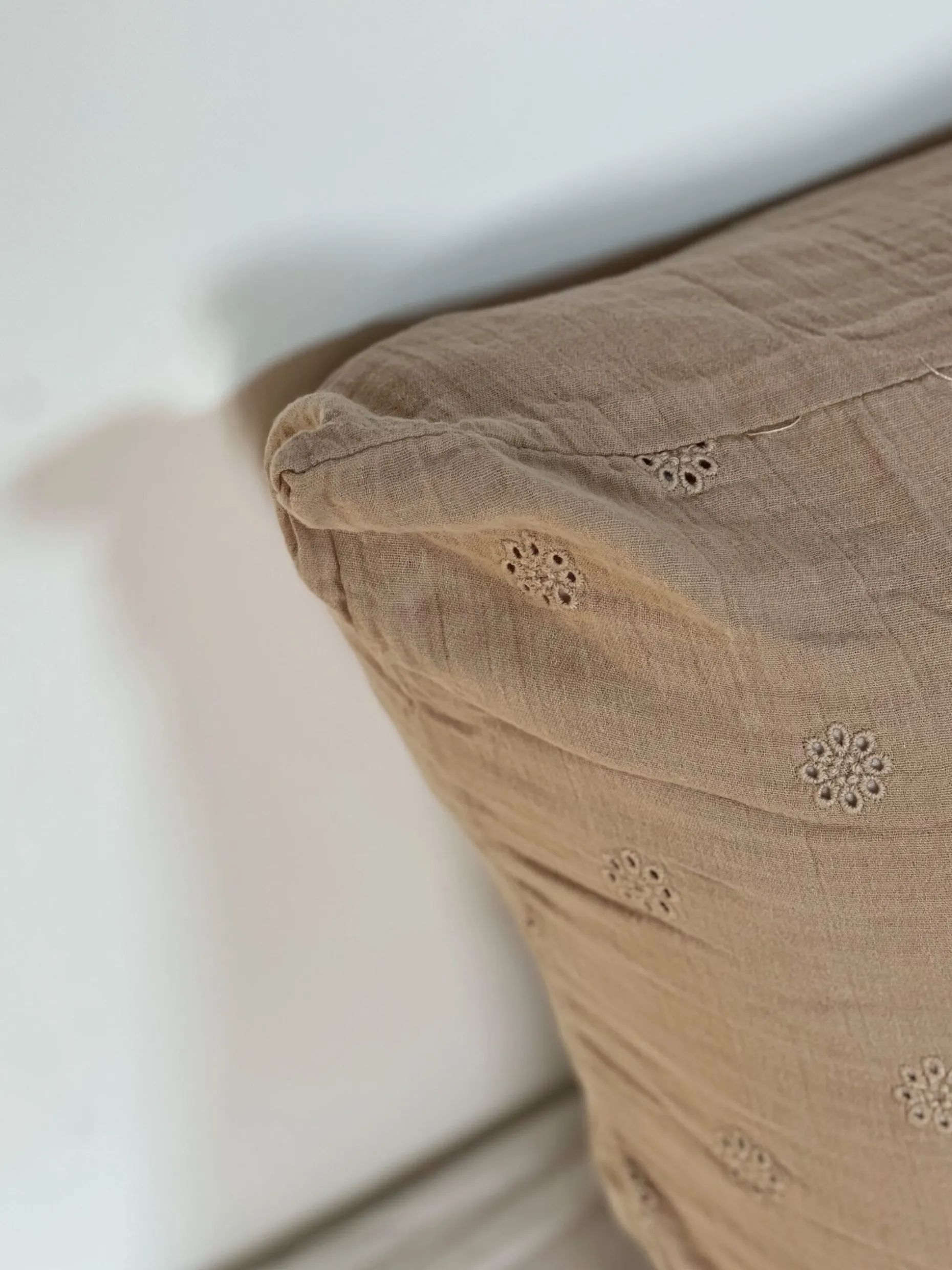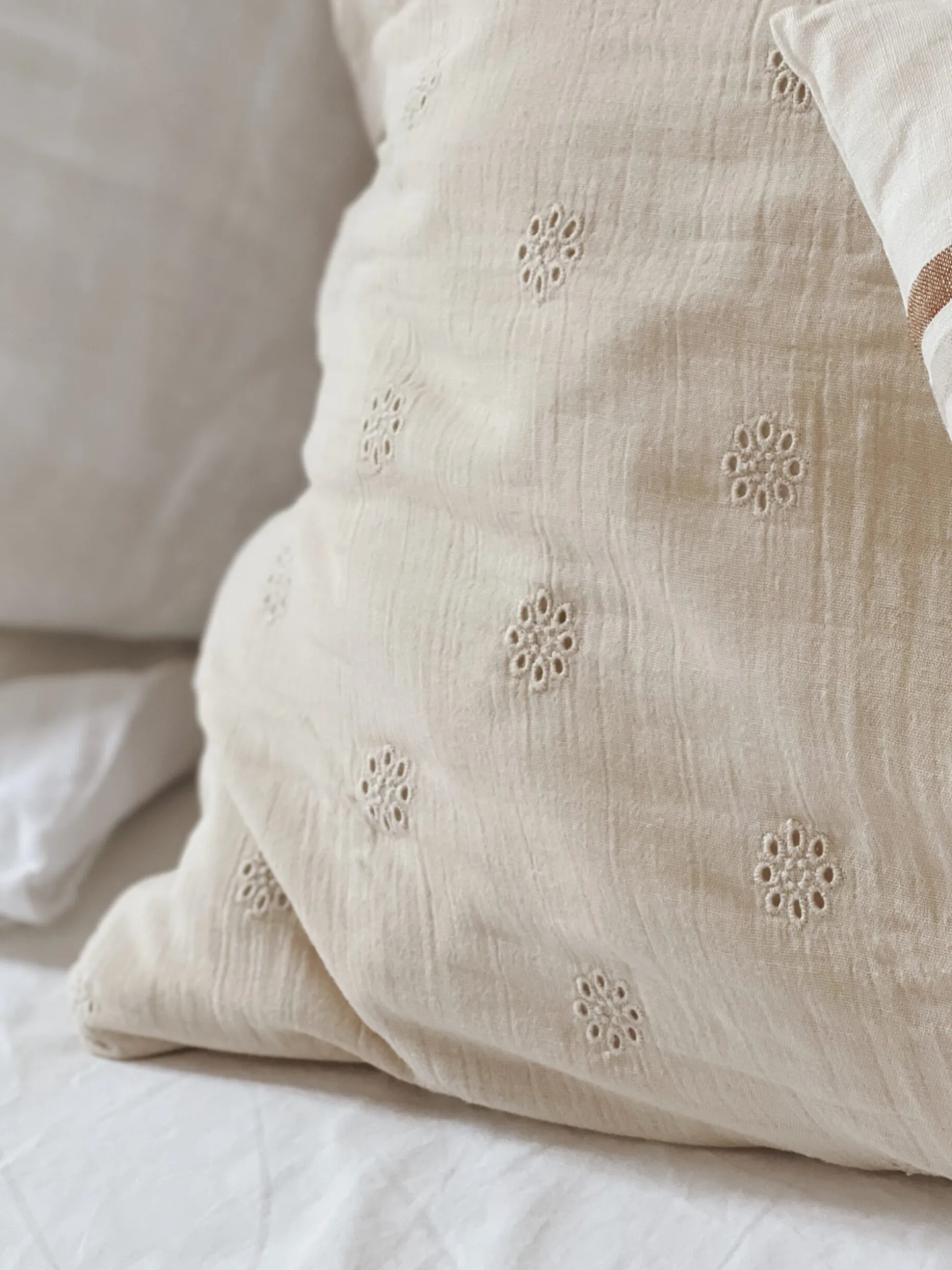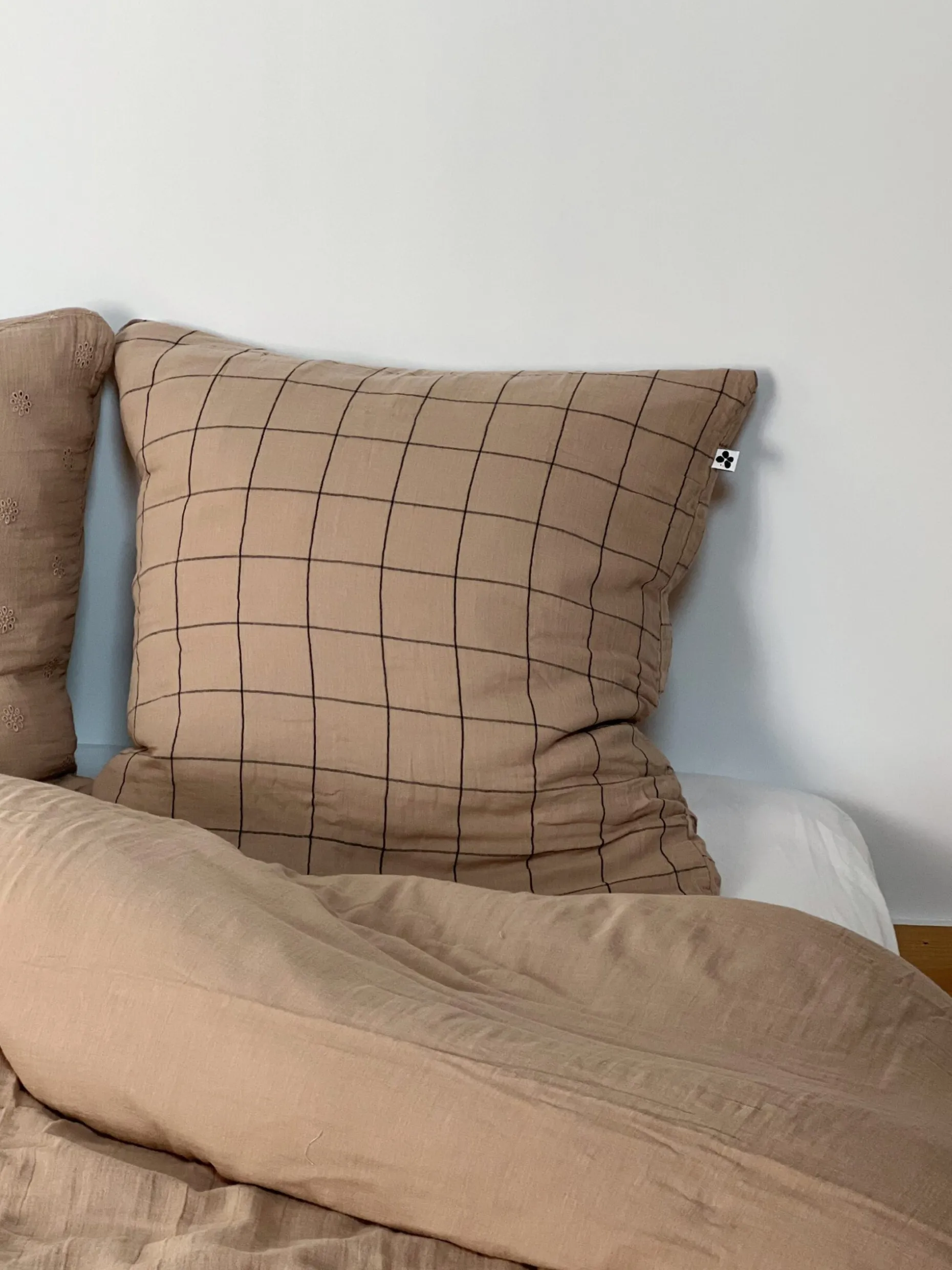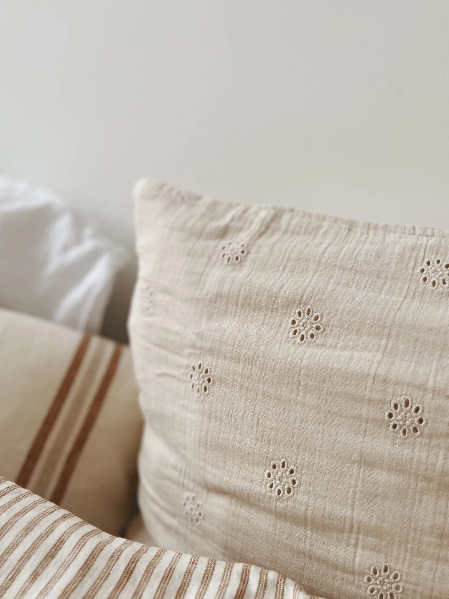 Choisissez la housse de couette en gaze de coton coloris pampa, le drap housse, le drap plat et la courtepointe pour une ambiance monochrome.