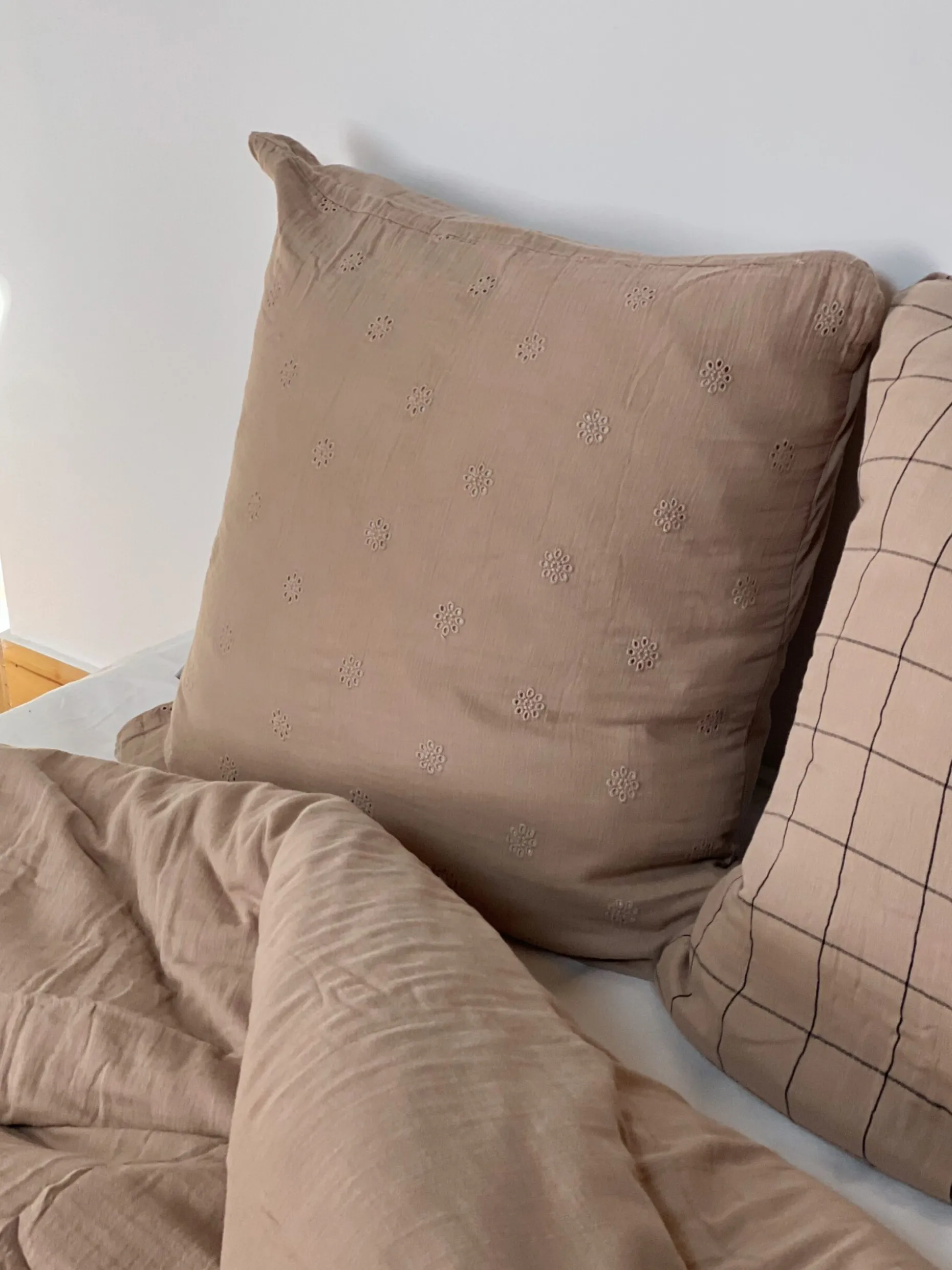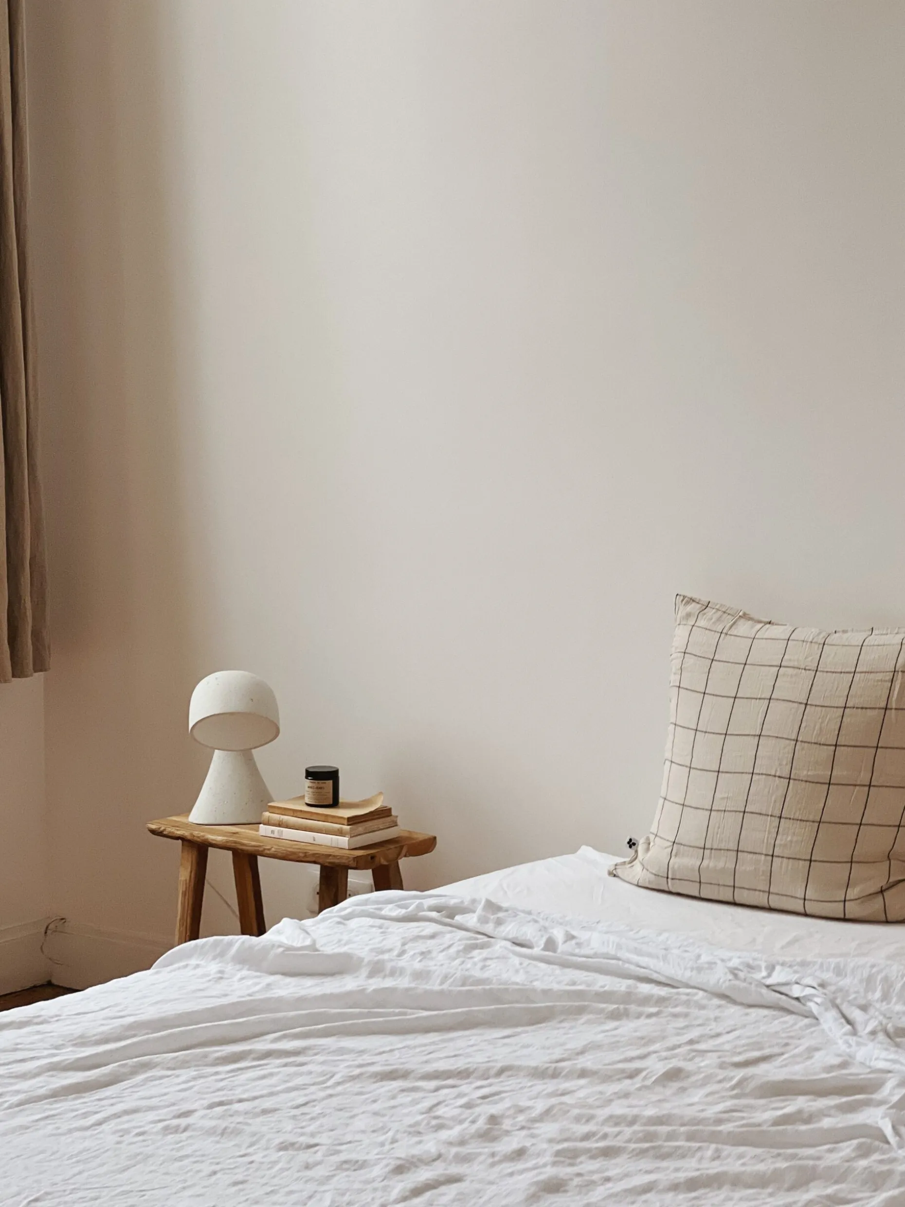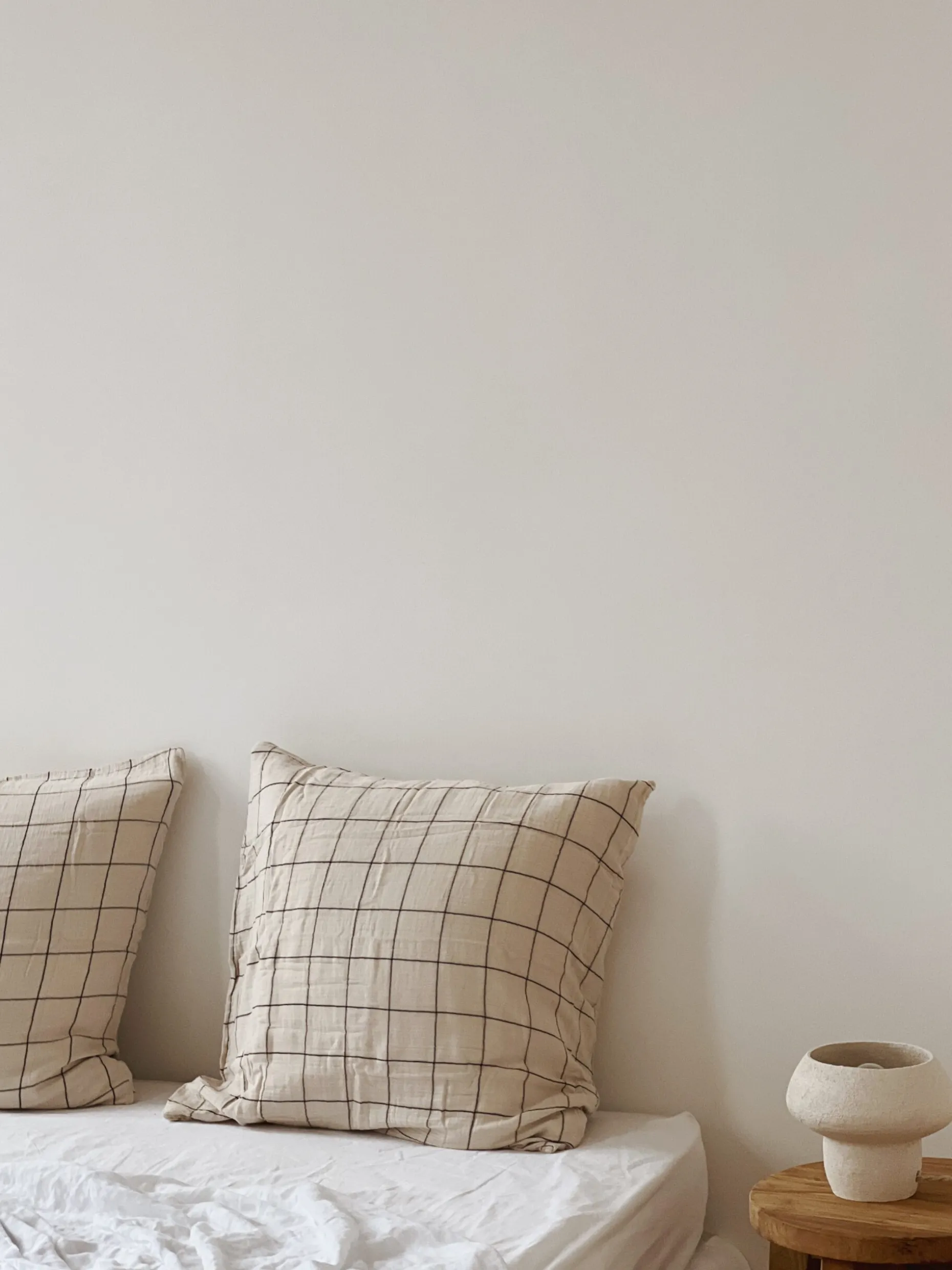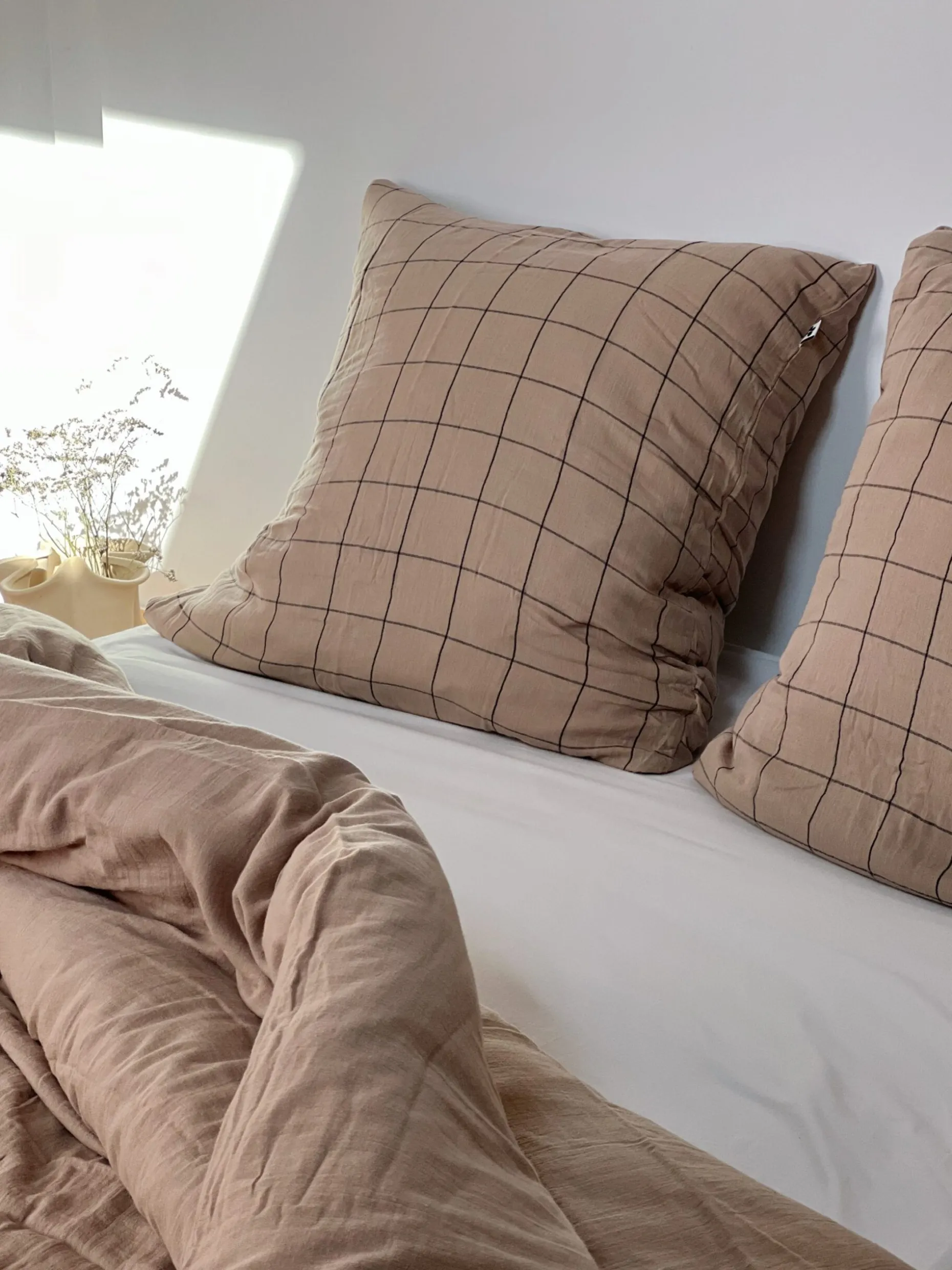 Choisissez la housse de couette en gaze de coton coloris pampa, le drap housse, le drap plat et la courtepointe pour une ambiance monochrome.