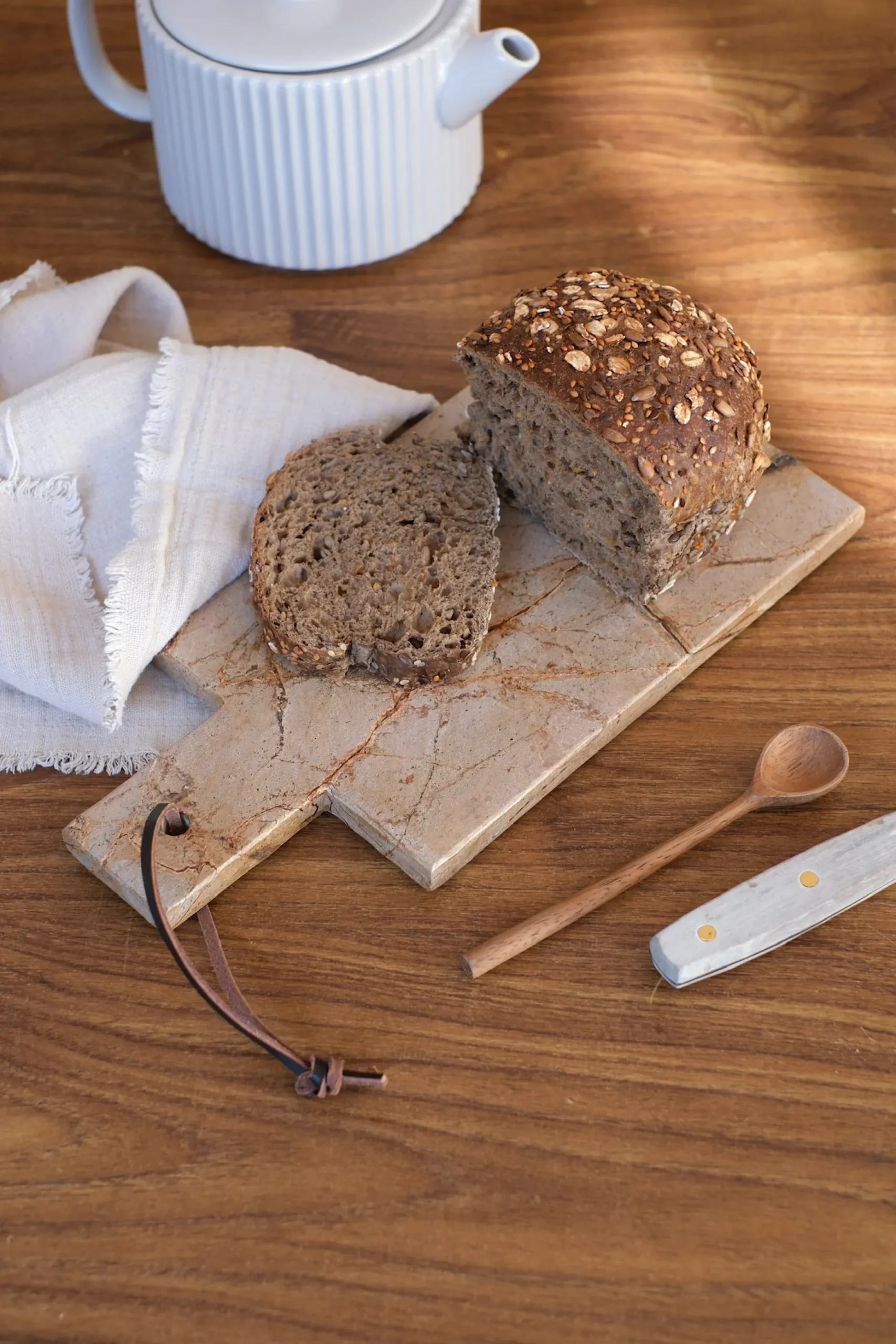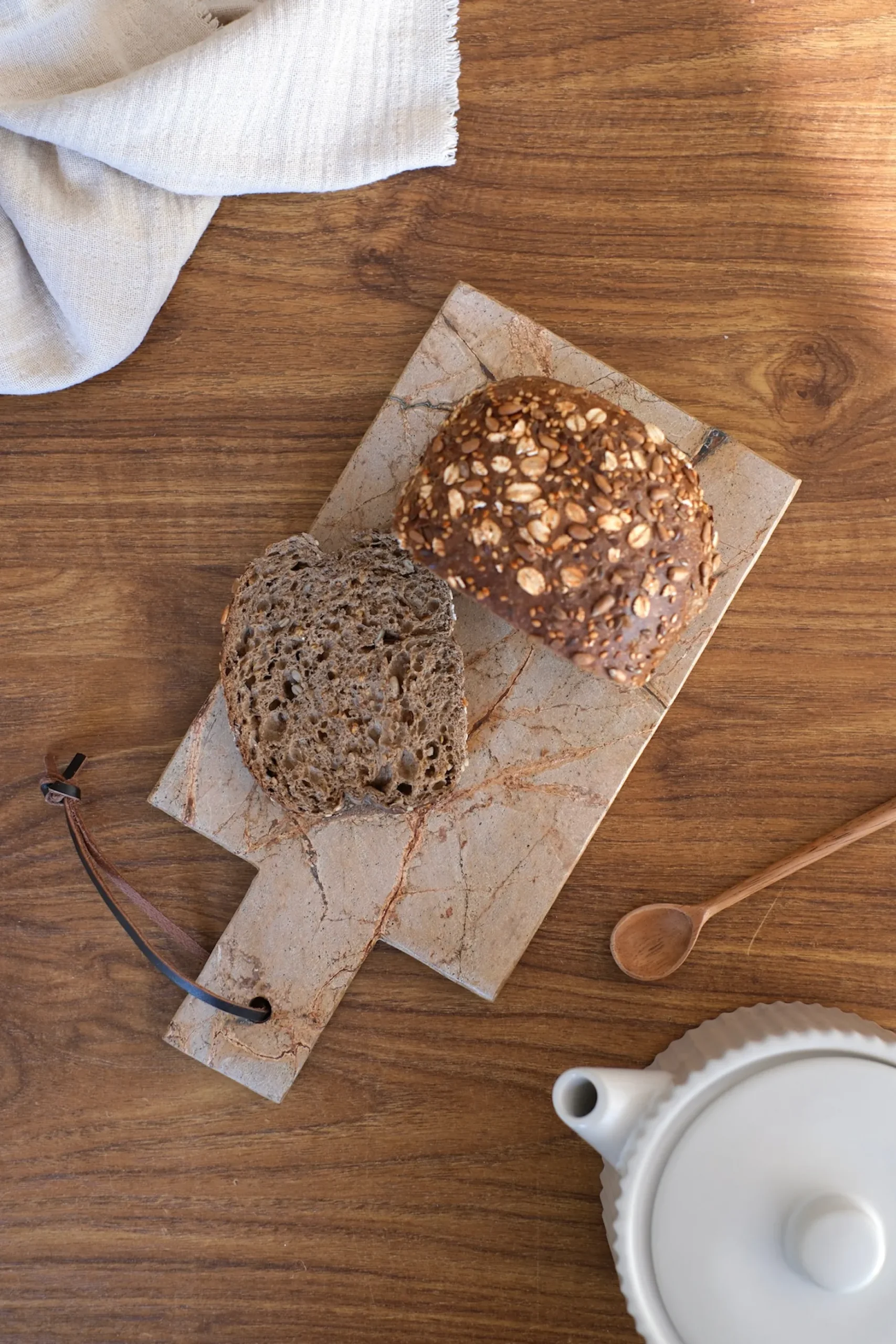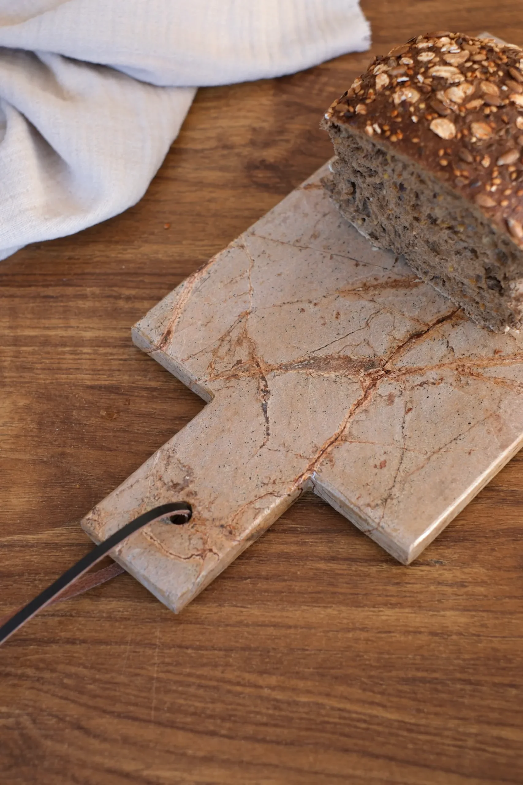 Cette planche à découper en marbre naturel révèle toute la beauté brute de la pierre avec ses teintes chaudes traversées de veinages blancs crème irréguliers. Chaque planche présente des nuances et des motifs de marbrures uniques, créés par la nature au fil de millénaires.