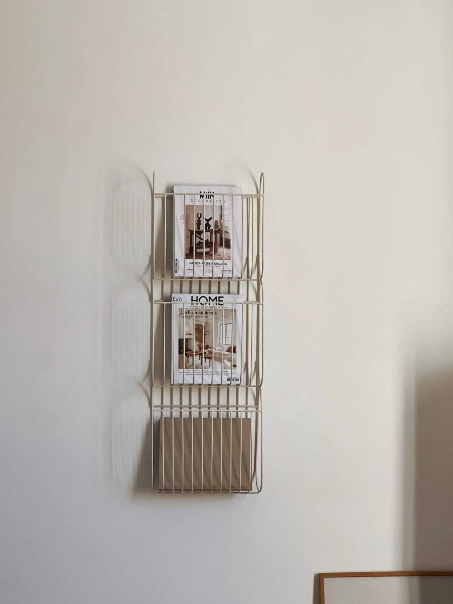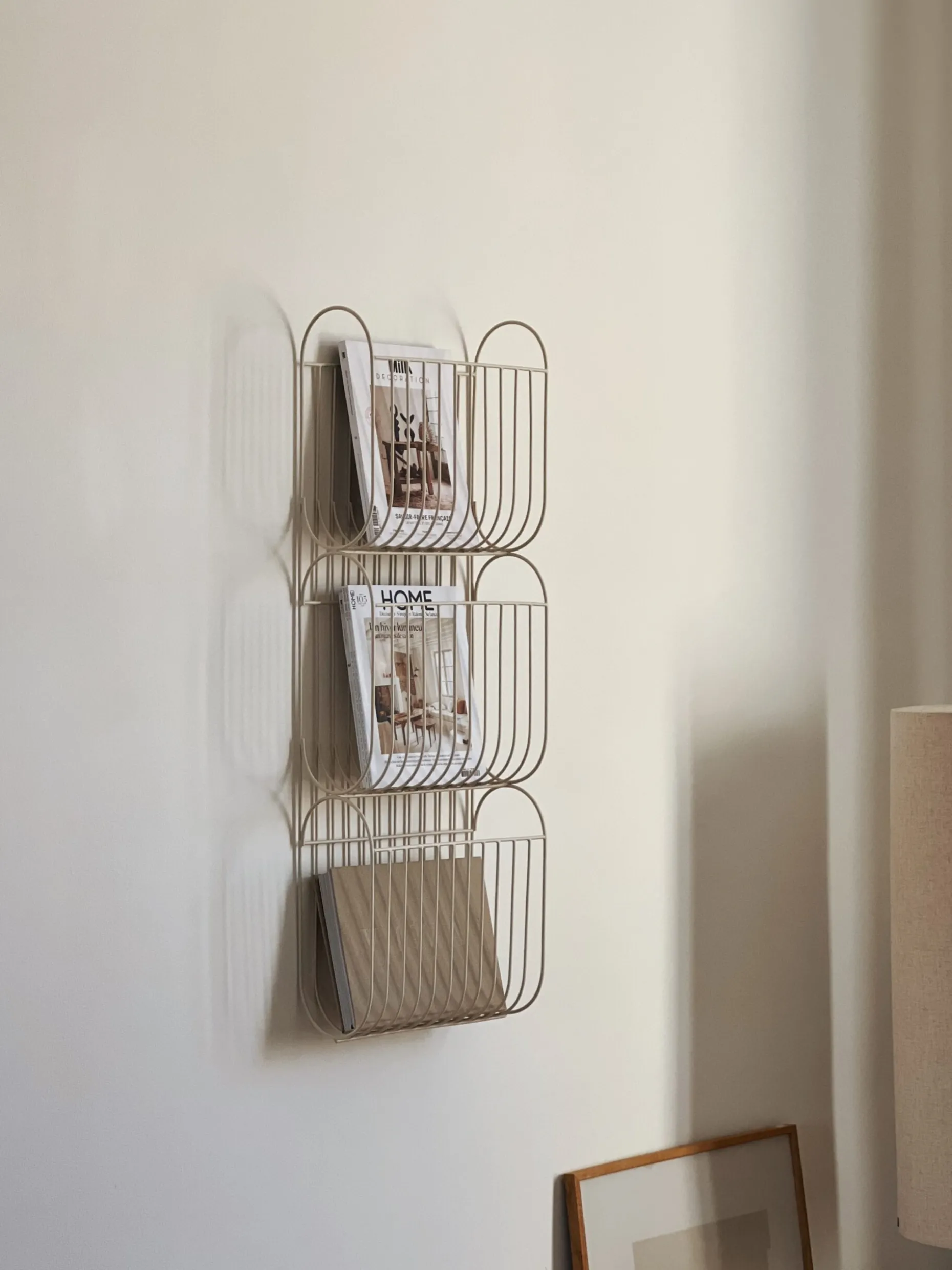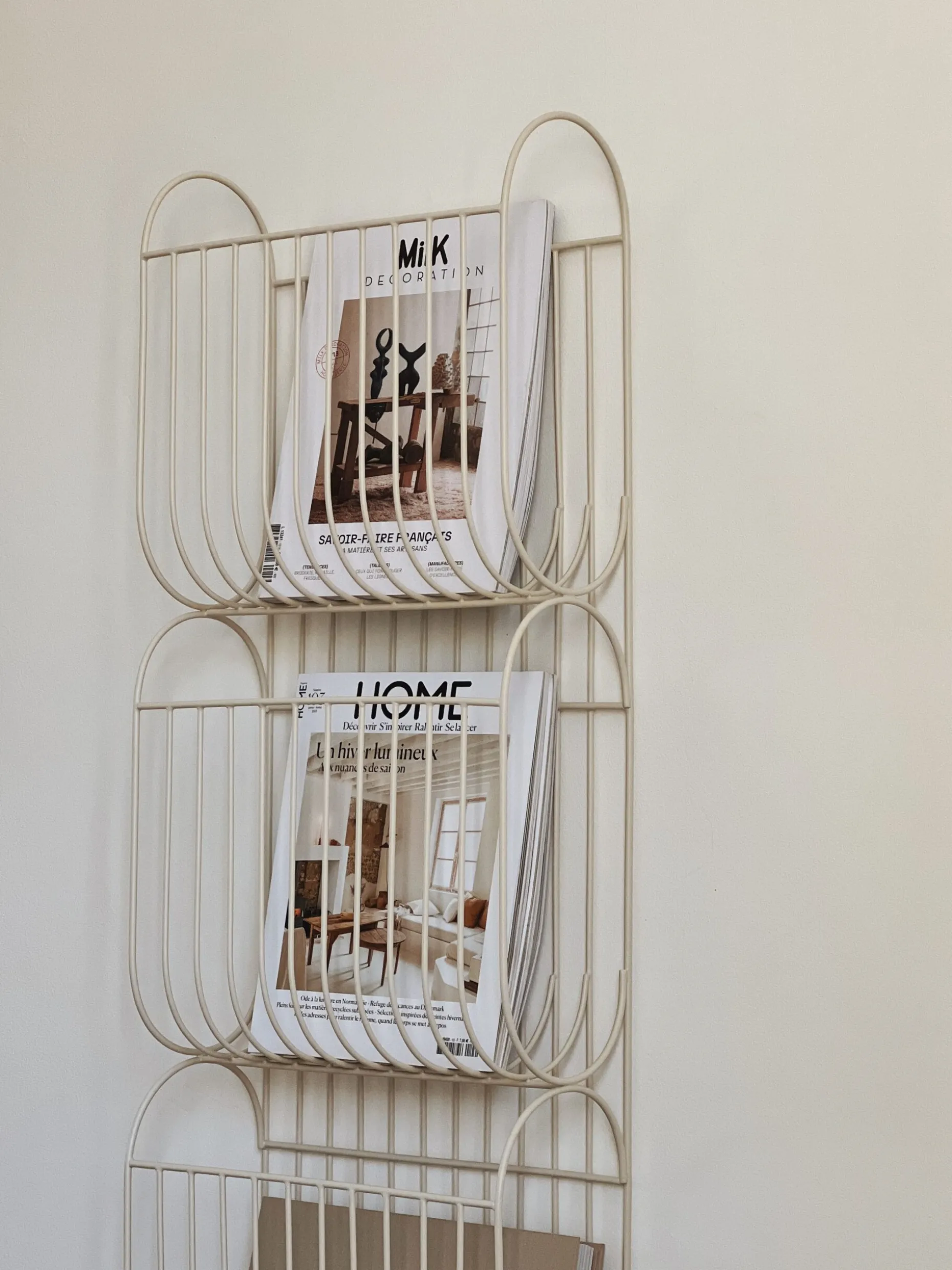 Support pratique pour ranger vos magazines. Le porte revue mural est composé d’acier de couleur beige, il se fixe au mur. Un must have déco qui vous aidera à ranger votre maison et garder un intérieur épuré !