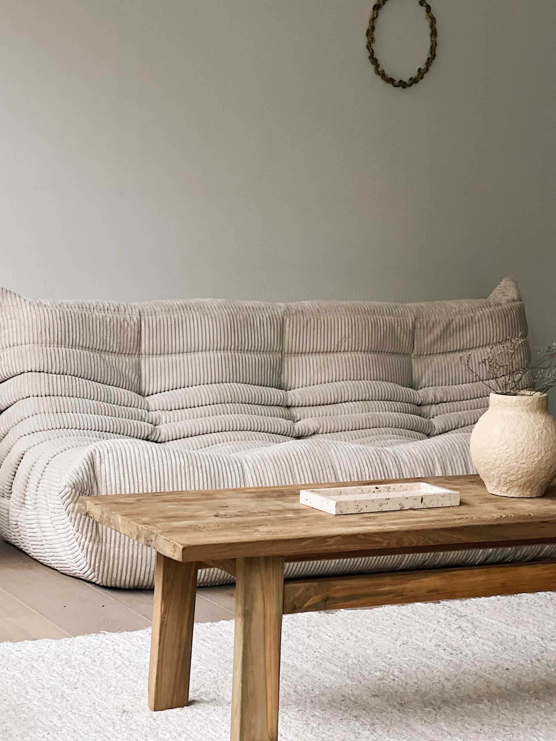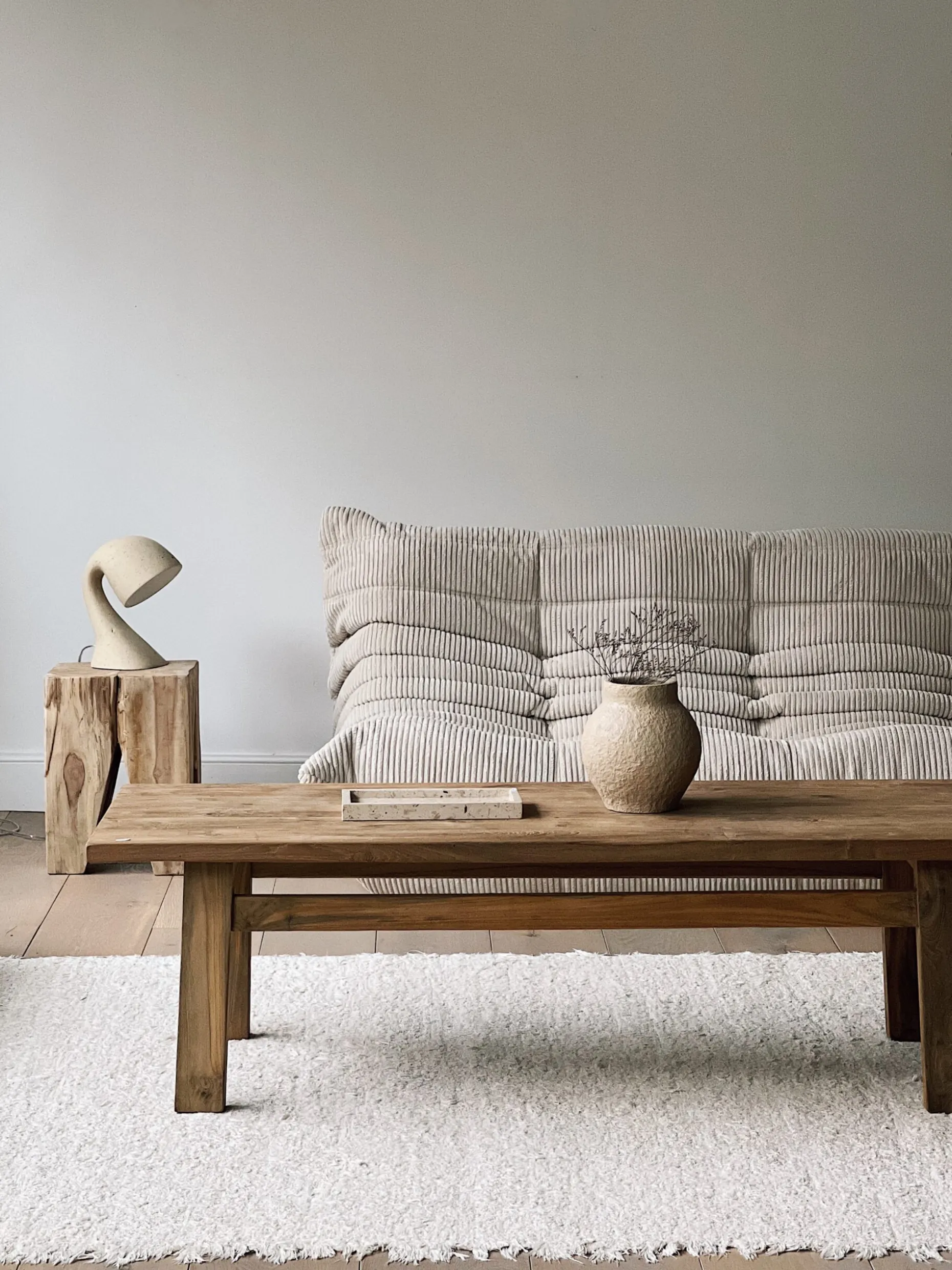 Jolie table basse fabriquée à la main en teck recyclé ! Vous apprécierez son coté vieilli et brut, ce qui donnera une touche “rustique” et naturelle à votre déco d’intérieur.