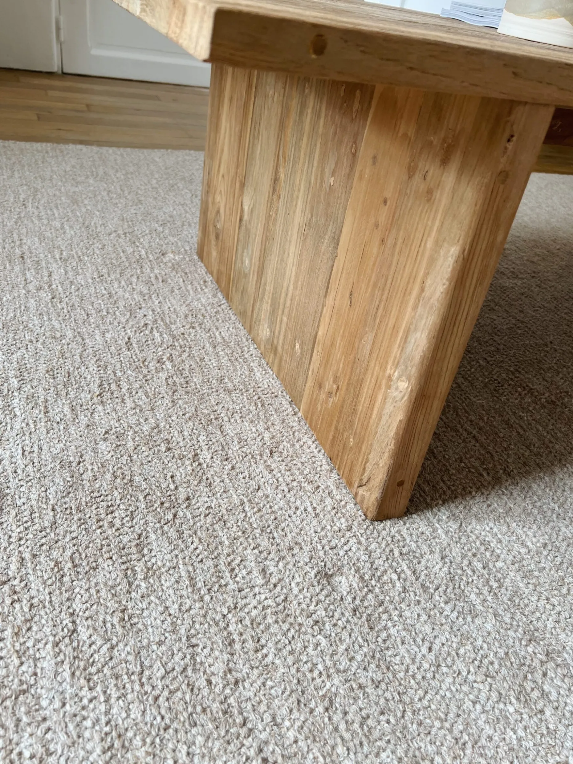Fait main, donc les dimensions peuvent légèrement variées d’une pièce à l’autre, ainsi que quelques irrégularités dans le bois qui font partie intégrante de la table.