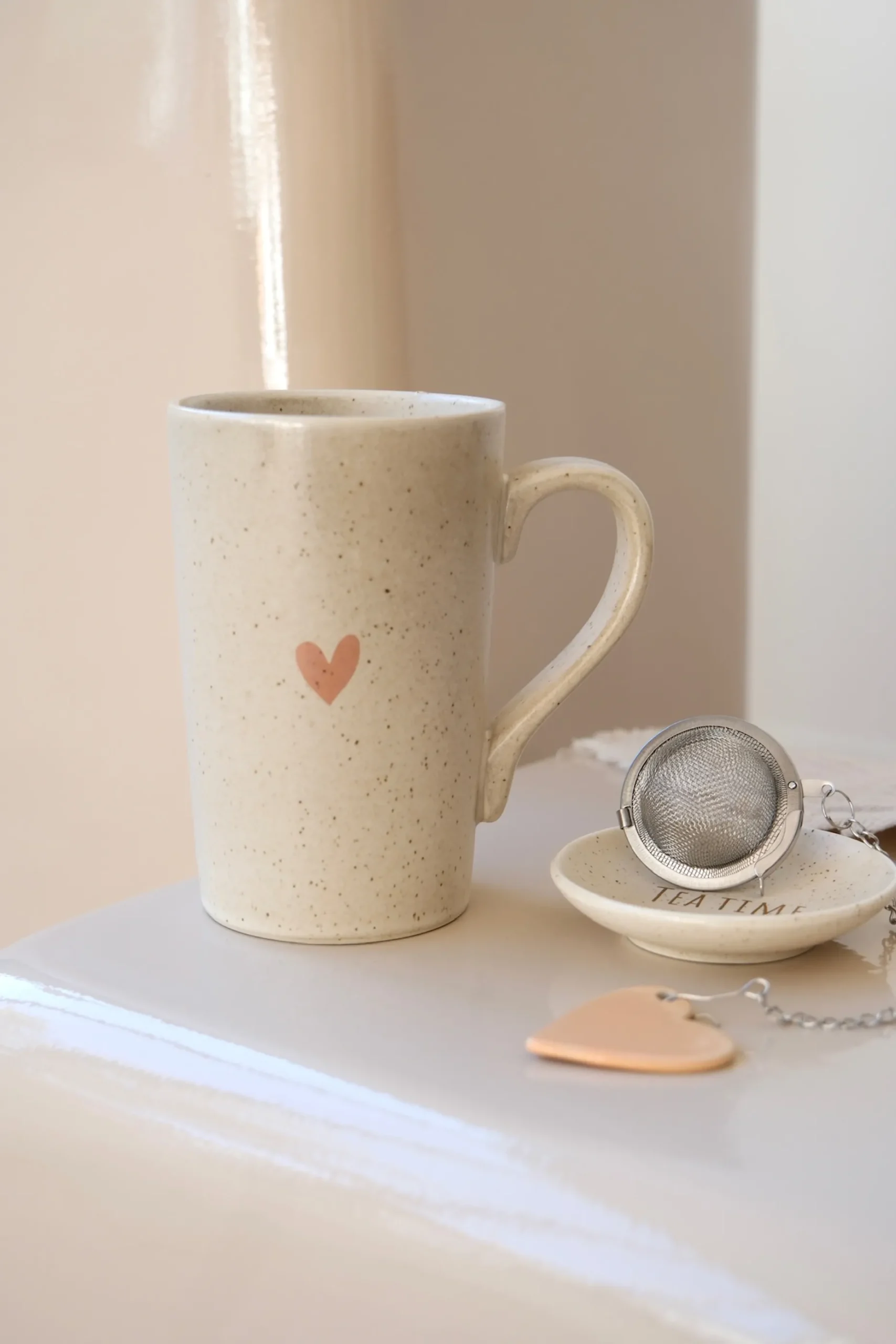- 1 tasse haute en porcelaine beige mouchetée avec cœur rose