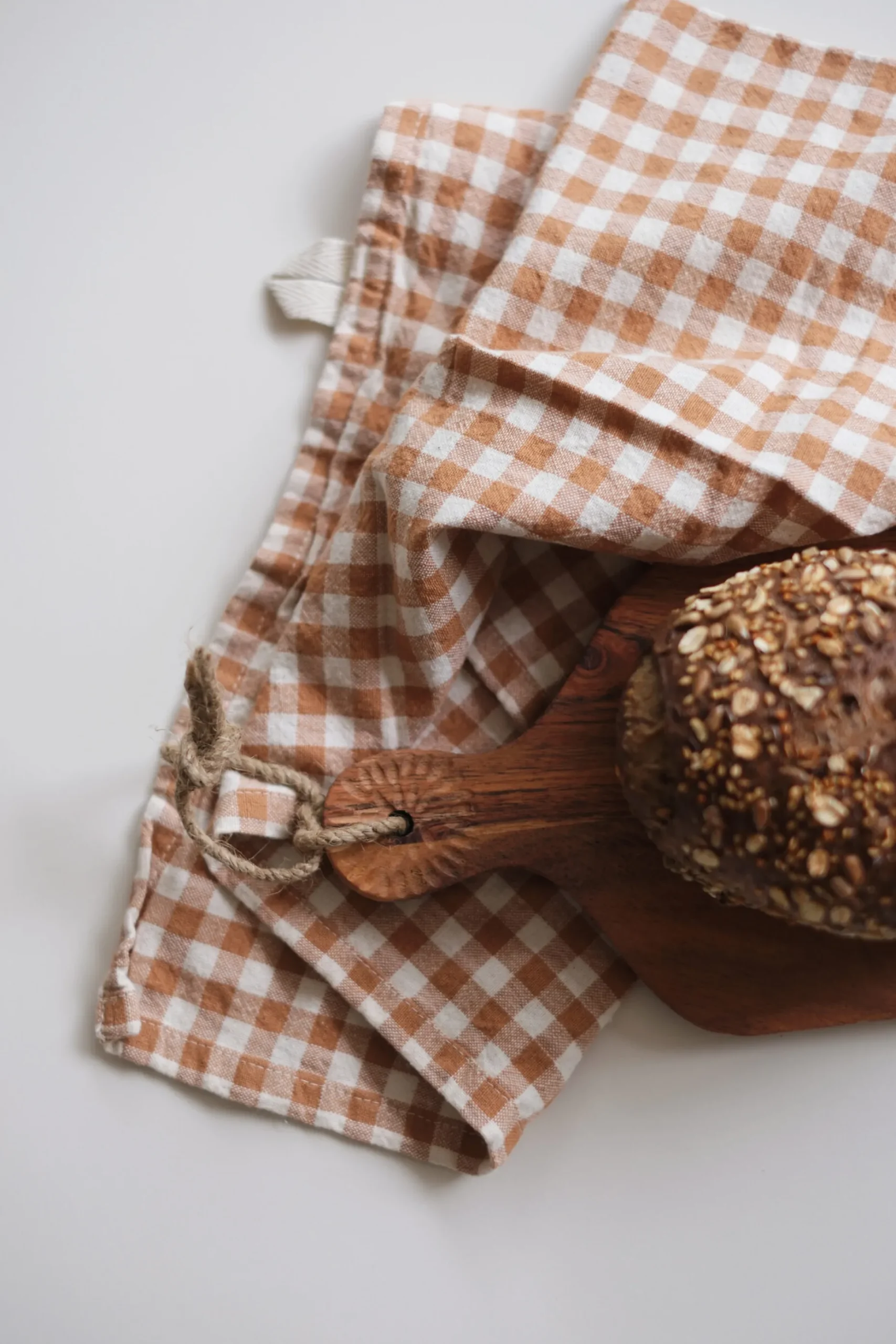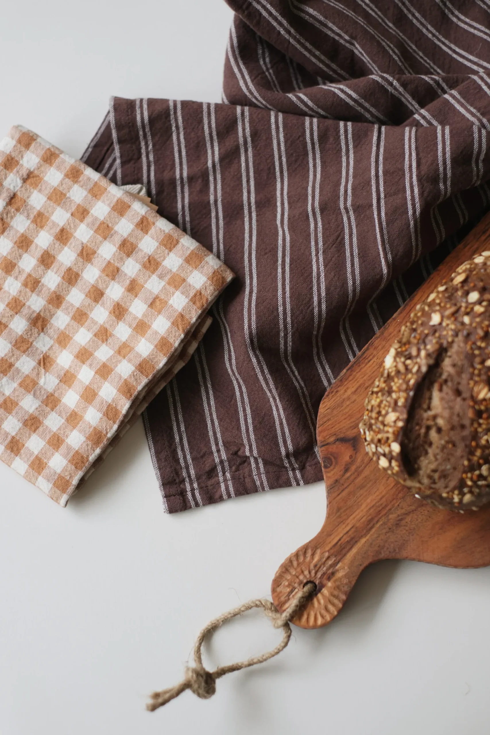 Disponible en 2 motifs intemporels aux tonalités terreuses et naturelles : le vichy caramel aux petits carreaux champêtres, et marron à fines rayures au style bistrot élégant.