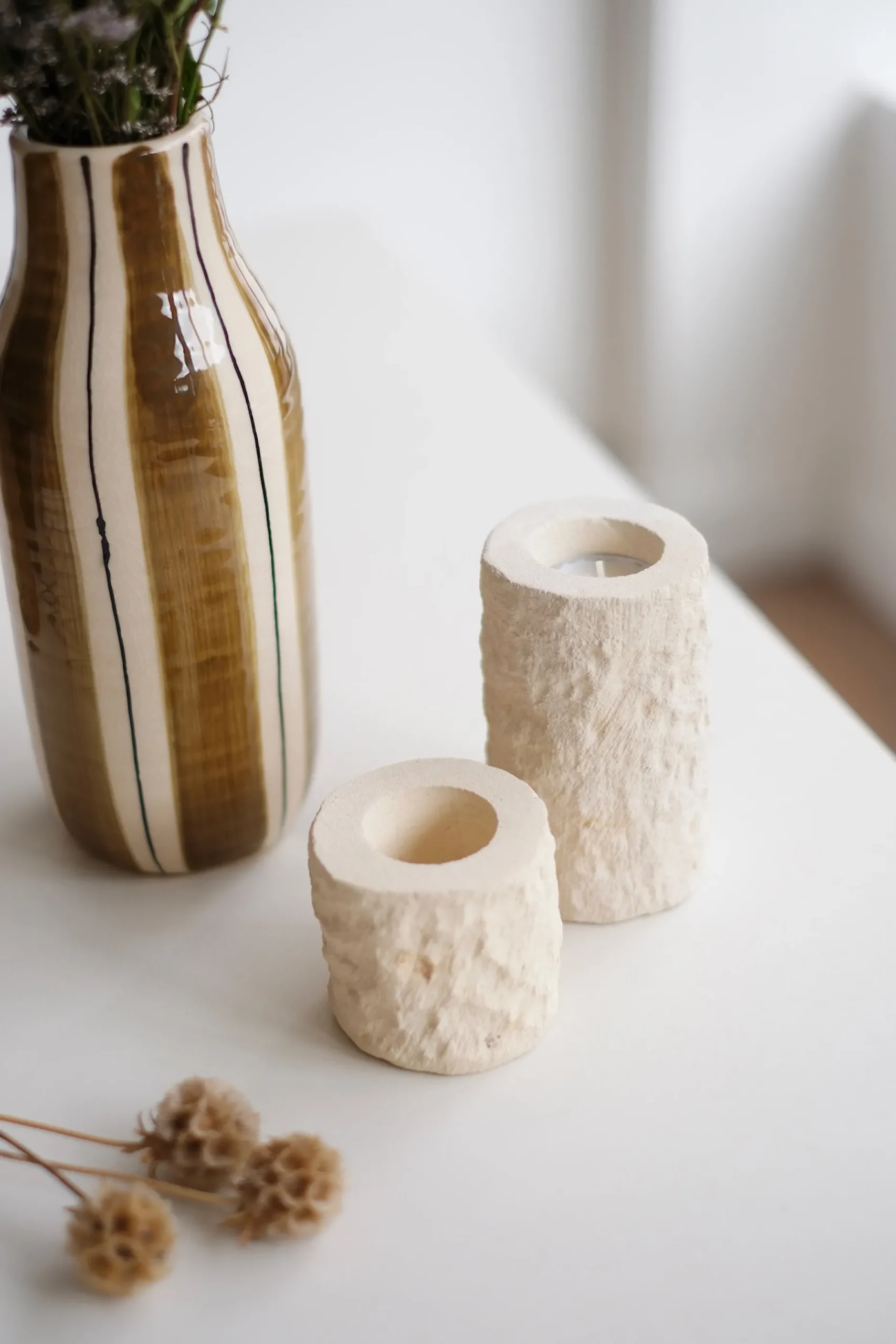 Ce bougeoir en grès naturel célèbre la beauté brute des matériaux authentiques selon la philosophie wabi-sabi japonaise. Taillé et sculpté à la main dans une pierre de grès compactée naturellement, chaque pièce révèle des variations uniques de teintes beiges, crème et sable.