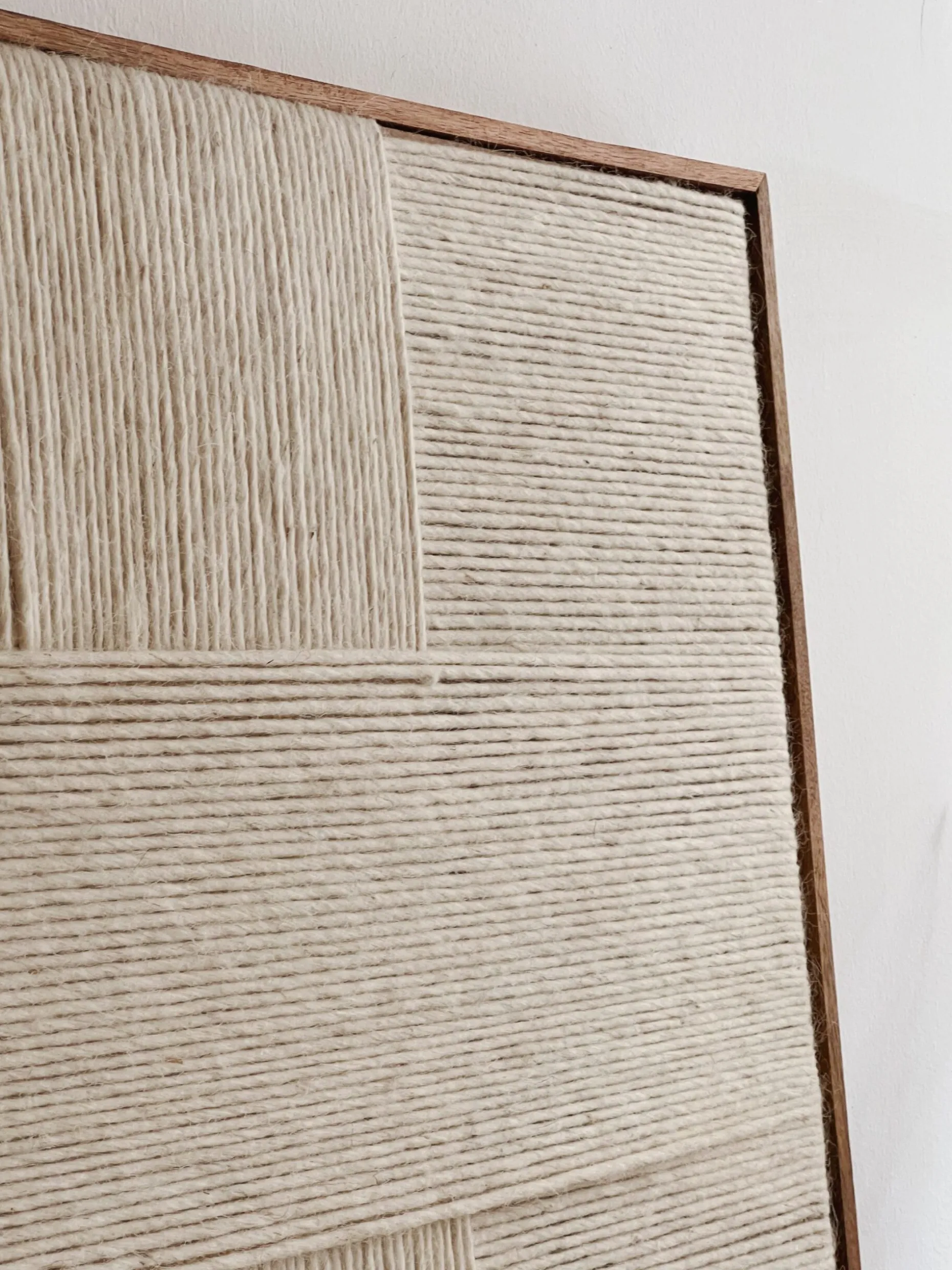 Décoration murale faite à la main où la ficelle de laine est soigneusement tendue et tissée sur un cadre en bois de manguier. Grâce à ce matériau, une dimension et une texture supplémentaires sont ajoutées à votre espace.