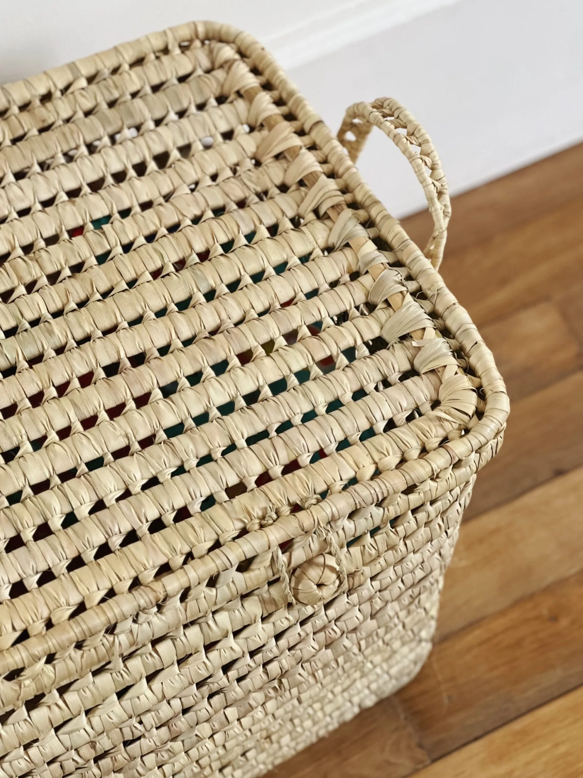 Grand coffre de rangement réalisé à la main en feuille de palmier. Cette malle est l’accessoire idéal au quotidien pour ranger votre maison. Pratique et jolie cette malle de rangement avec couvercle apportera une touche déco bohème à votre intérieur tout en rangeant jouets, plaids et linge de maison. Le coffre possède 2 anses de chaque côté pour une utilisation facile et un couvercle qui ferme à l’aide de 2 boutons en feuille de palmier.