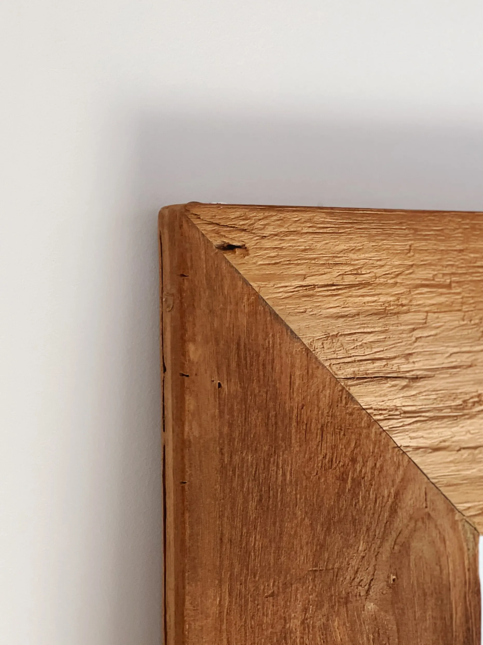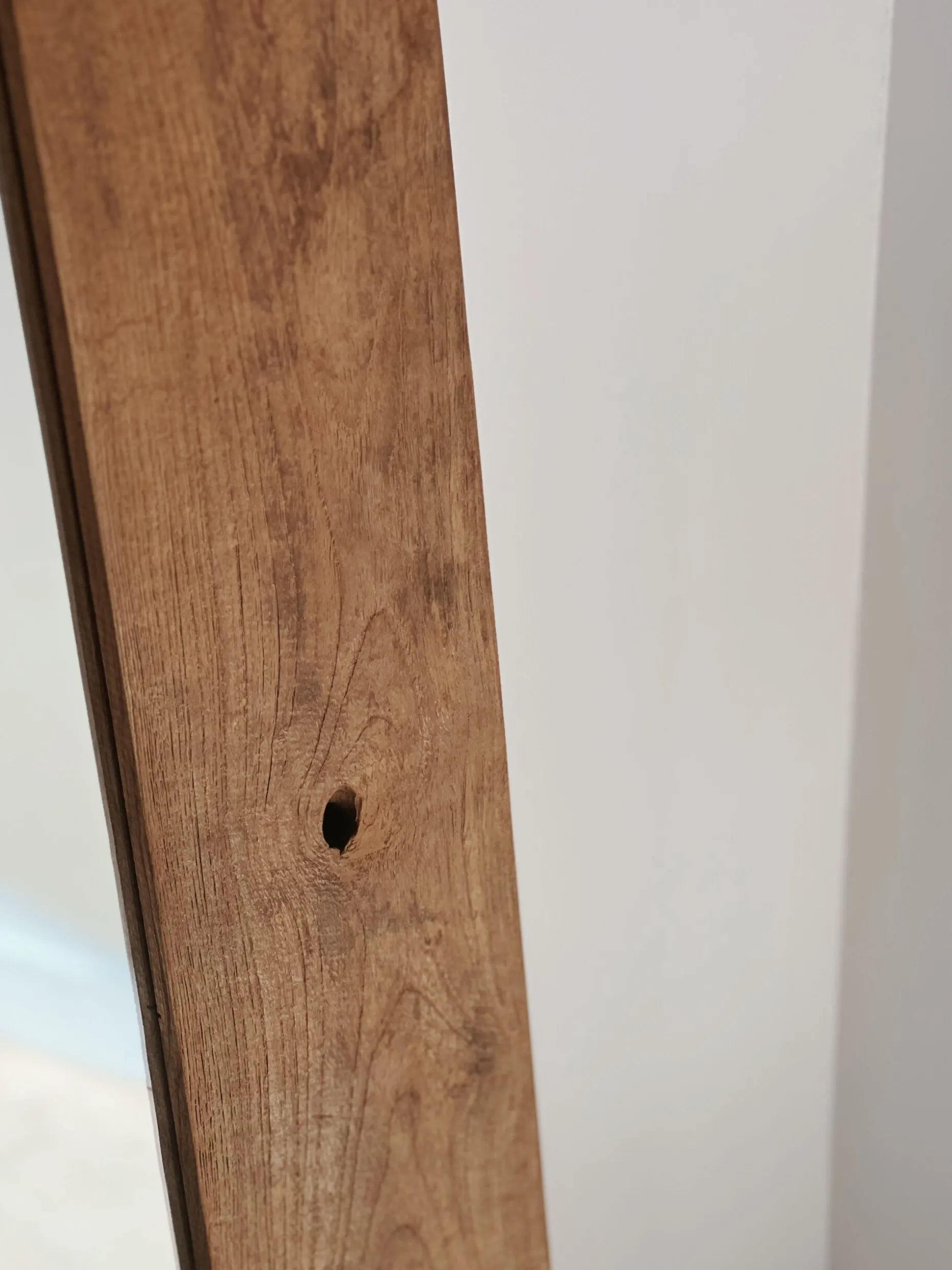 Ce miroir est entièrement réalisé à partir de teck recyclé, la seconde vie du bois peut laisser apparaitre des imperfections, des traces du temps parfois des petits trous.
