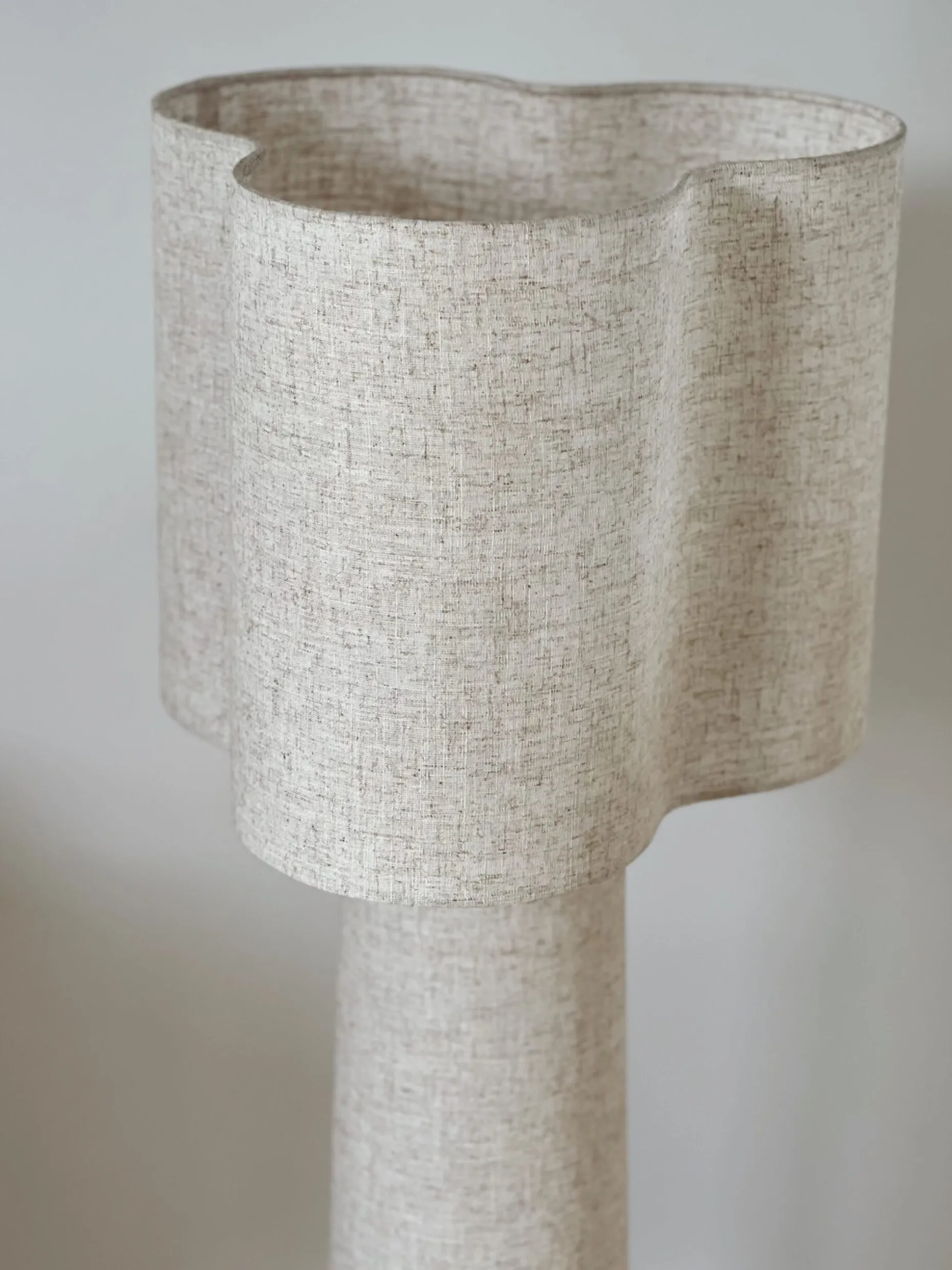 Lampadaire en toile beige composé d’un socle cylindrique et d’un abat jour en forme de trèfle. Vous apprécierez le design sobre et épuré de cette lampe qui trouvera facilement sa place dans votre intérieur.