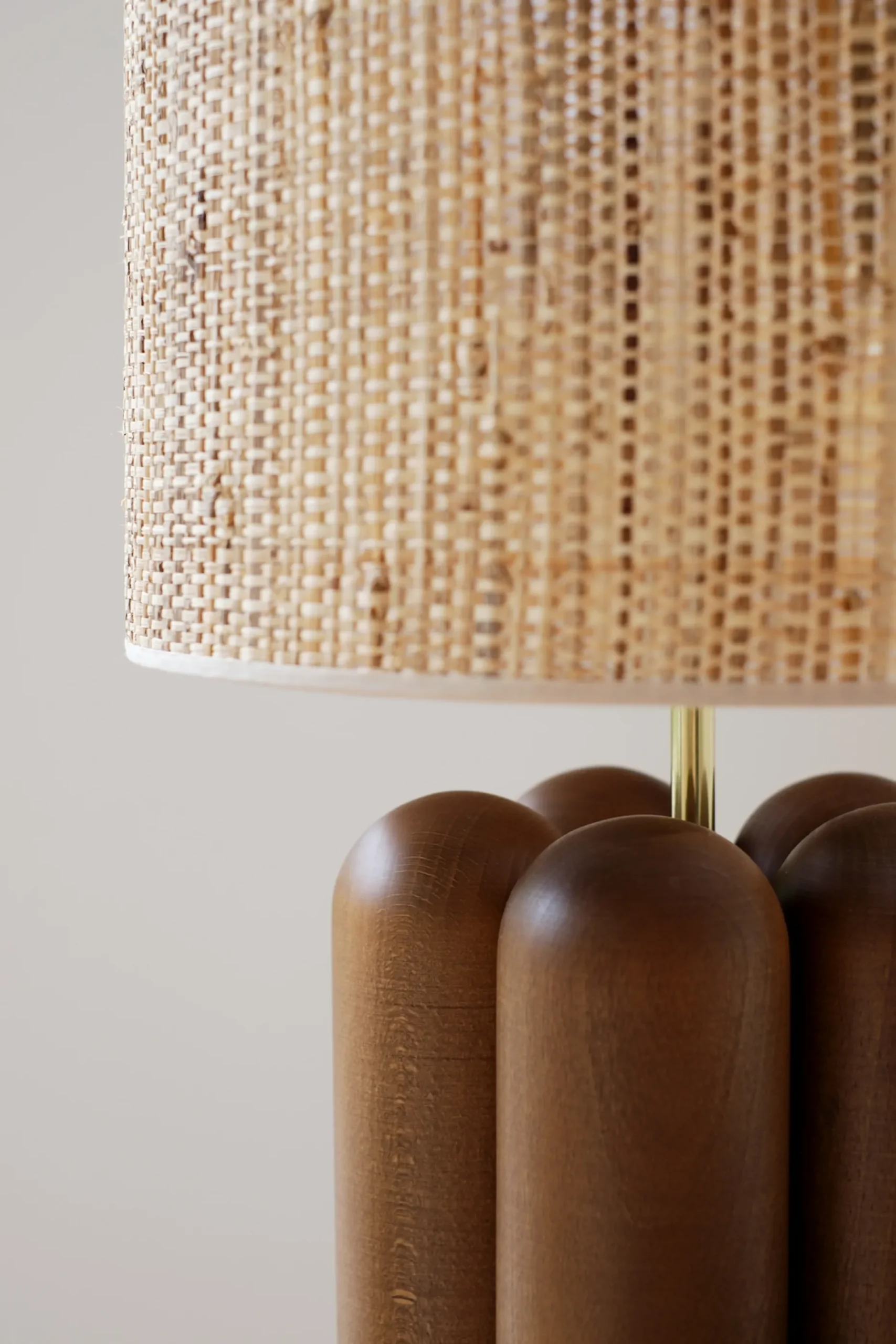 Matériaux : Bois de hêtre verni (pied) – Raphia naturel ou Lin crème (abat-jour)