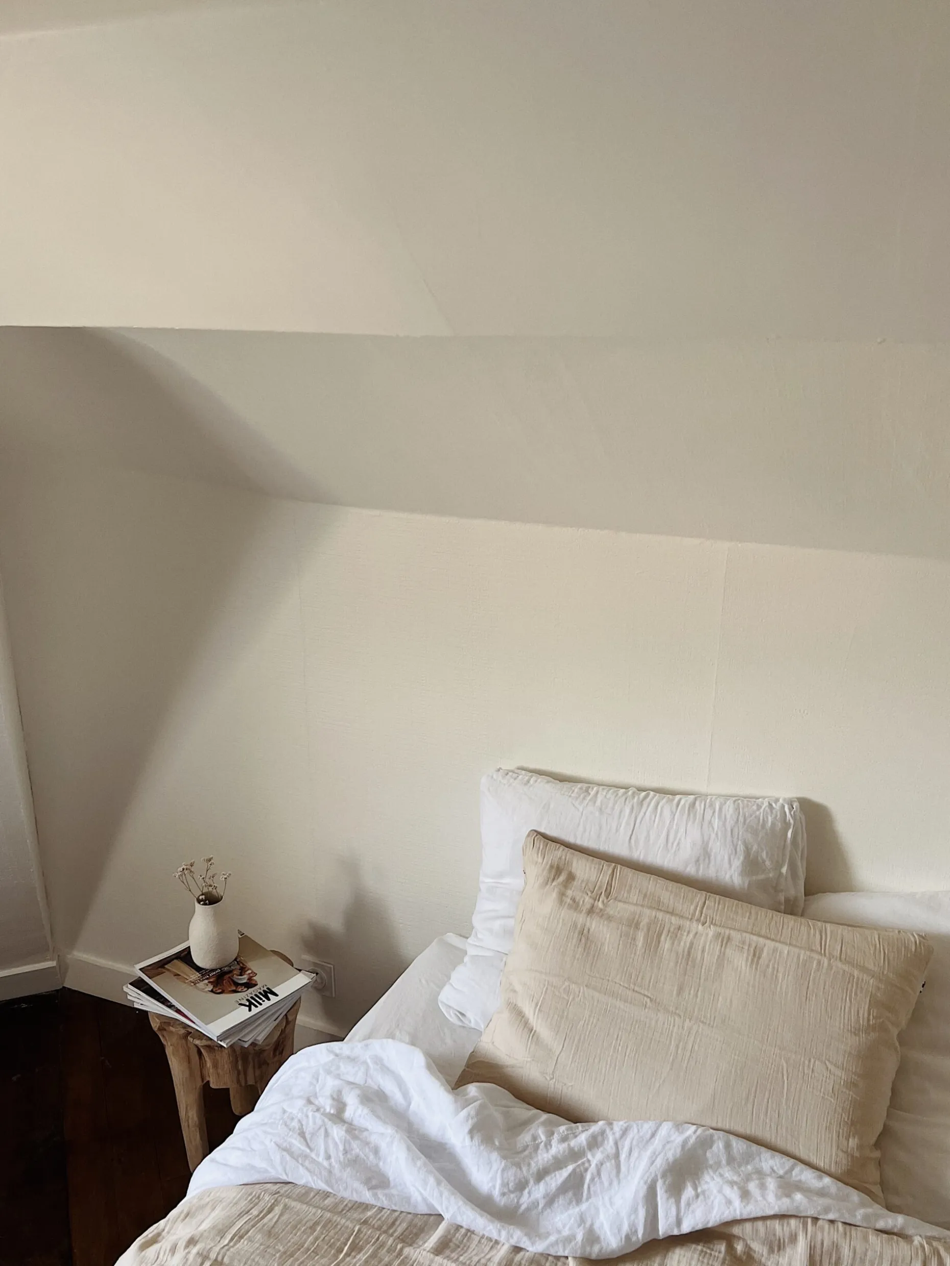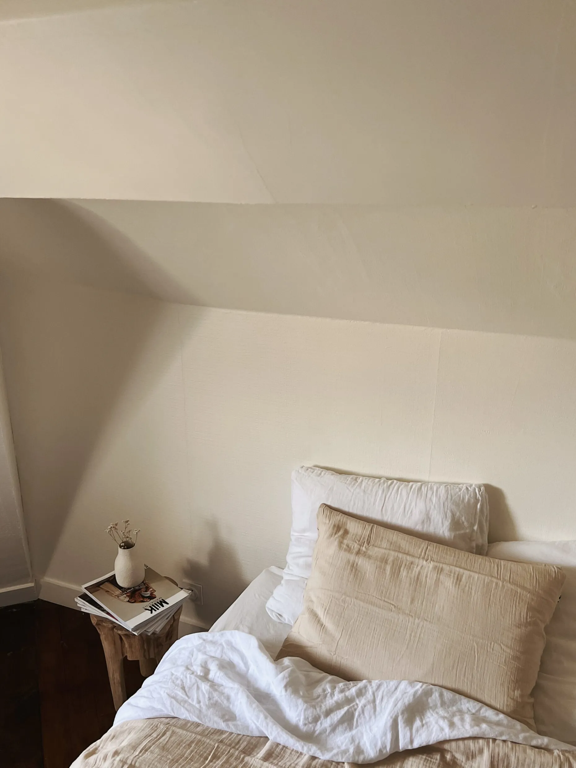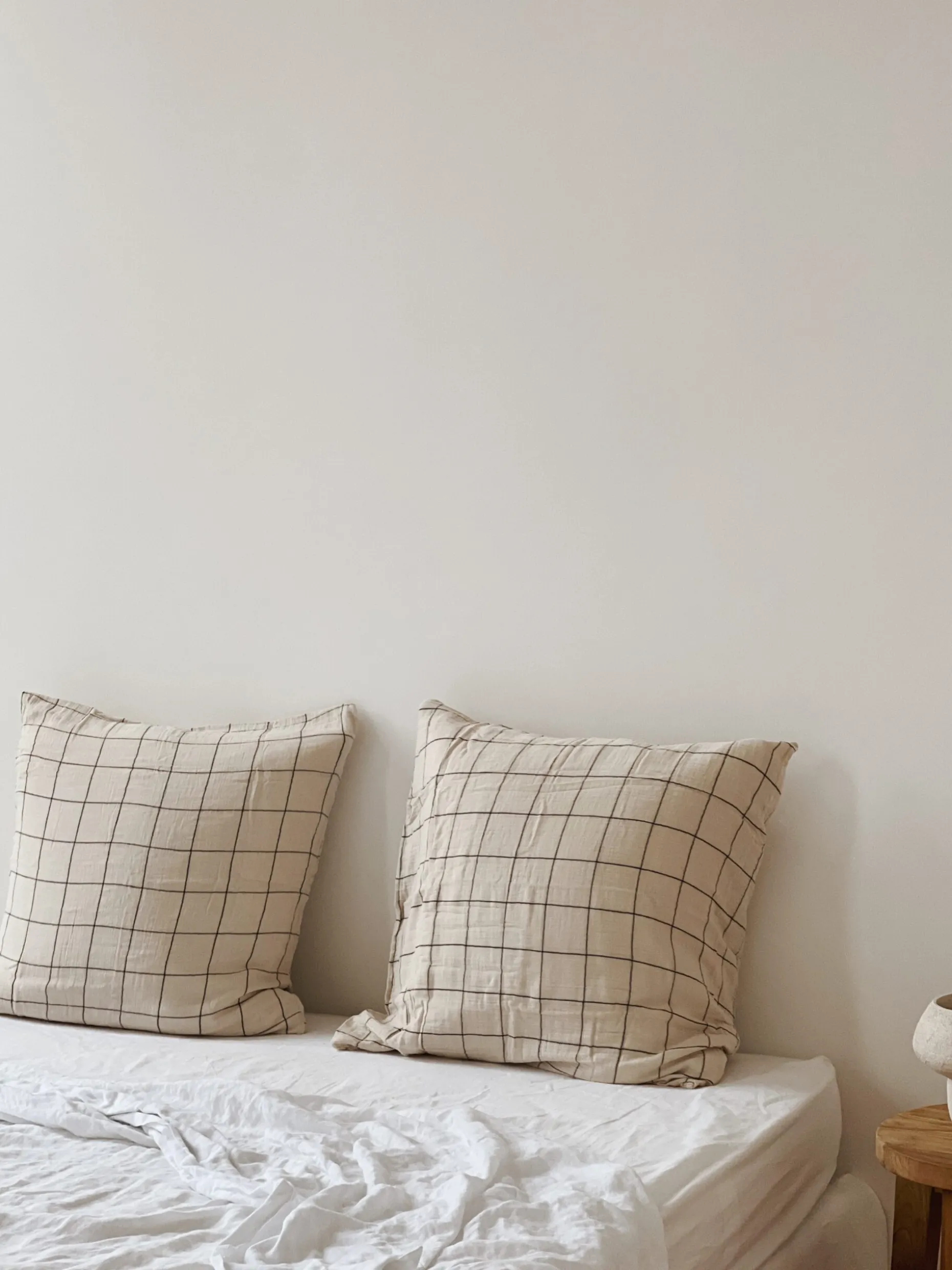 Choisissez la housse de couette en gaze de coton coloris pampa, le drap housse, le drap plat et la courtepointe pour une ambiance monochrome.