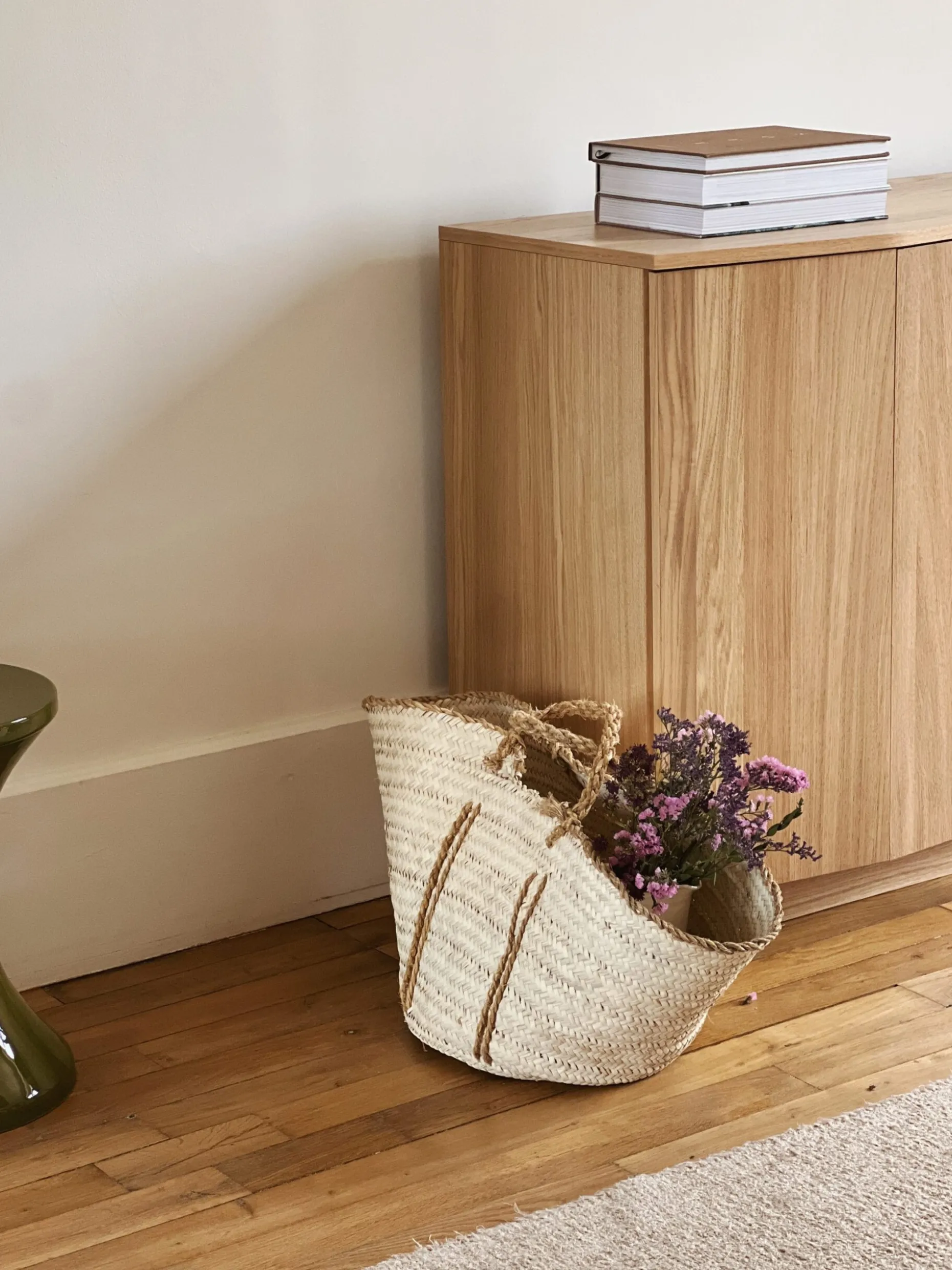 Disponible en deux tailles, il peut accueillir vos fruits, textiles, courses ou objets du quotidien. Chaque modèle présente un motif distinct, tressé à la main sur les côtés du panier.