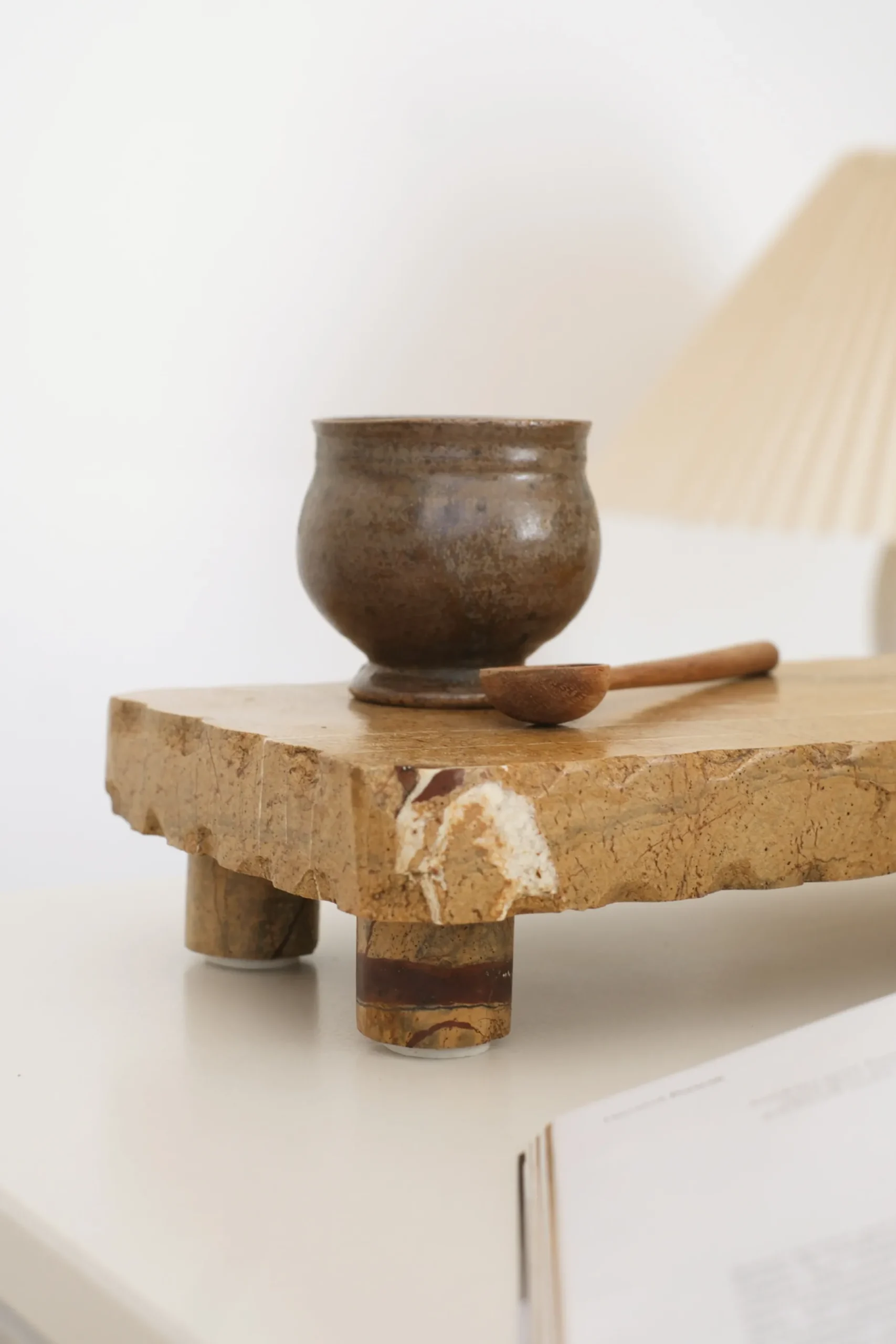 Cette planche à découper en marbre naturel révèle toute la beauté brute de la pierre avec ses teintes chaudes traversées de veinages blancs crème irréguliers. Chaque planche présente des nuances et des motifs de marbrures uniques, créés par la nature au fil de millénaires.