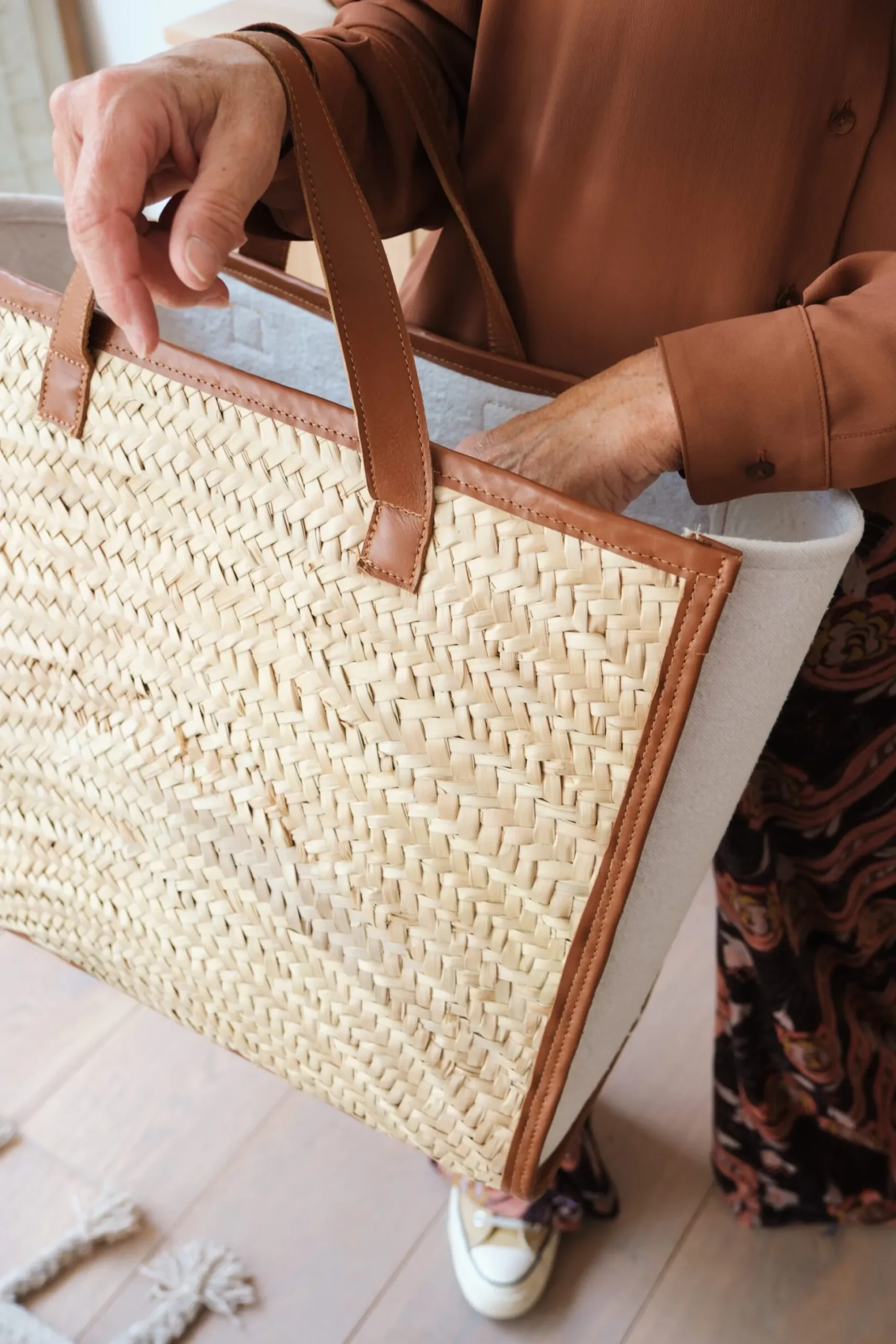 Matières : Feuilles de palmier tressées, toile, anses en cuir