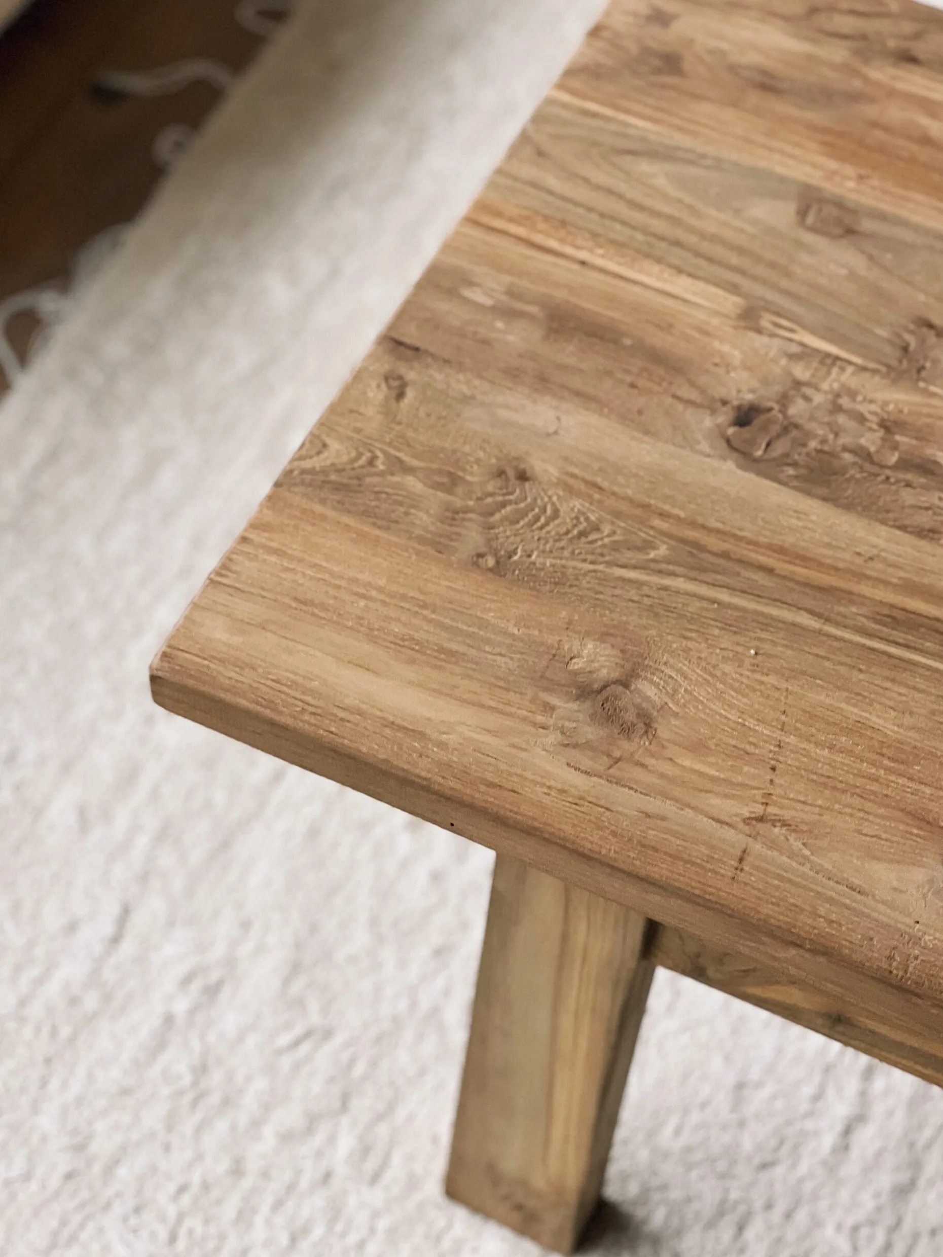 Jolie table basse fabriquée à la main en teck recyclé ! Vous apprécierez son coté vieilli et brut, ce qui donnera une touche “rustique” et naturelle à votre déco d’intérieur.
