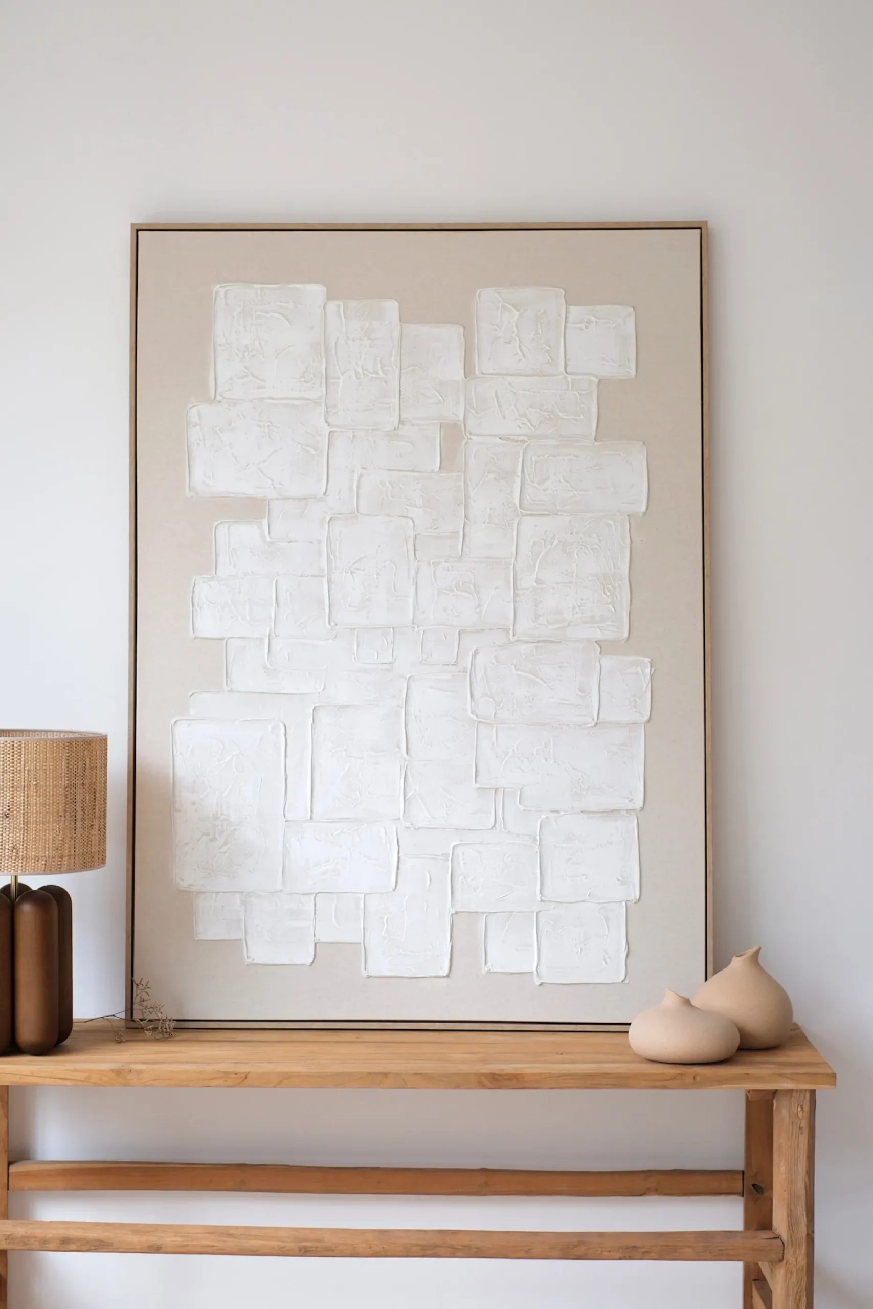 Le tableau décoratif mural Vicenza est une pièce au style épuré et texturé, idéale pour sublimer un mur sans alourdir l’atmosphère. Peinte à la main sur une base en lin naturel, elle présente des motifs en blanc cassé en léger relief. Le travail de matière donne de la profondeur à la composition tout en conservant une grande douceur visuelle.