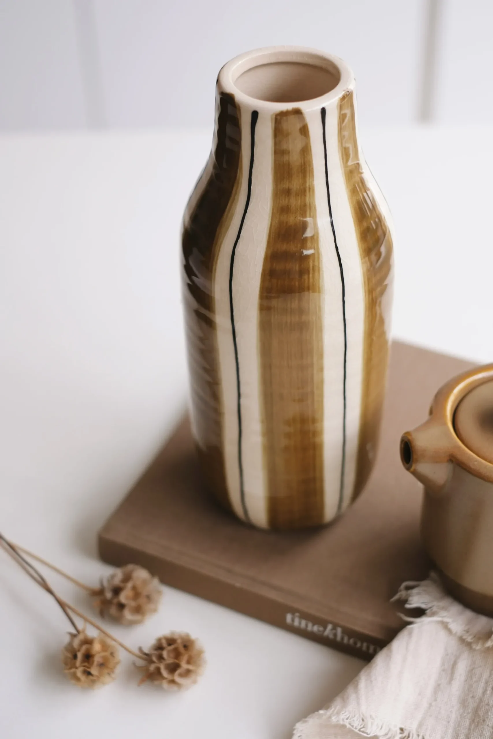 Ce vase en céramique joue sur les contrastes avec élégance. Ses larges bandes beige naturel sont soulignées par de fins liserés noirs verticaux qui créent un rythme graphique sophistiqué. La forme galbée aux épaules arrondies et au col resserré évoque les silhouettes des vases traditionnels revisités avec modernité.
